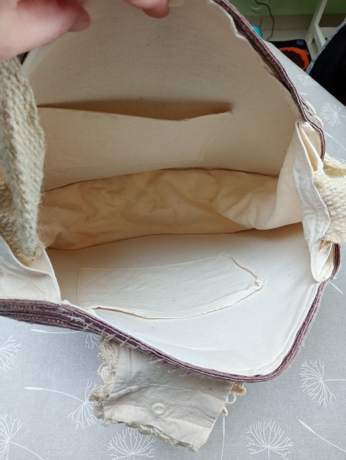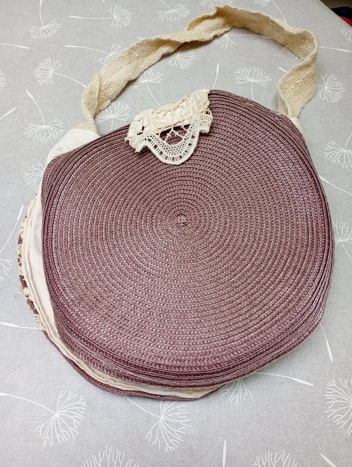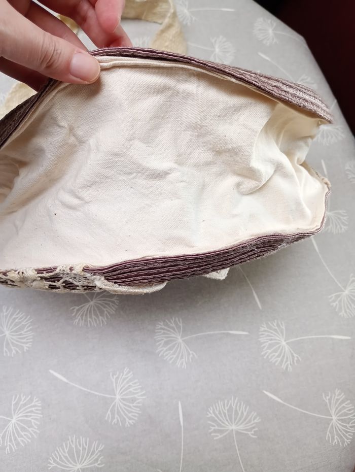 Sac original en toile de lin avec dentelle. Diamètre : 35 cm. Profondeur : 12 cm. Très bon état.