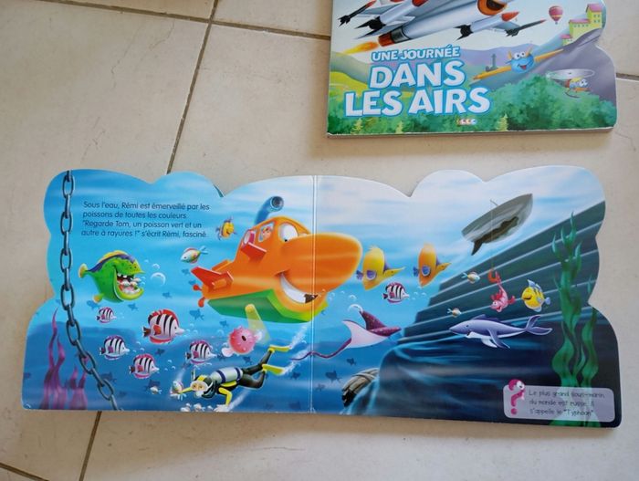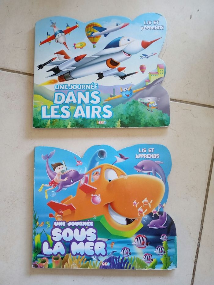 Livre cartonné lis et apprend 1er une journée sous la mer Remi est passionné de vie sous-marine.Un matin il va vivre une formidable aventure.Lis l'histoire et apprend des faits étonnants sur les sous-marques et 2eme une journée dans les airs. Jeff est un petit avion de chasse.Aujourd'hui, il va vivre une formidable aventure.Lis l'histoire et apprend des faits étonnants sur les avions Livres cartonnés en très bon état minis usures sur les coins
