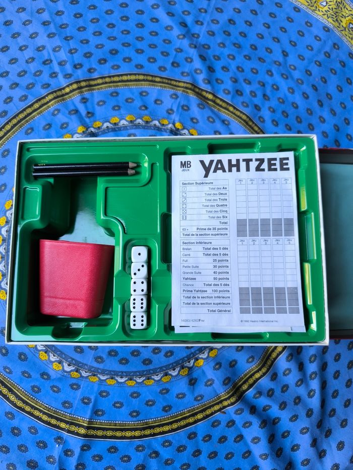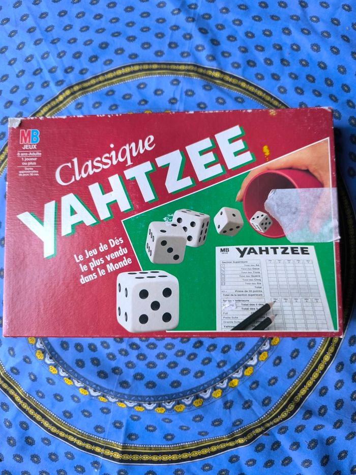 Voici le célèbre jeu de dés Yahtzee, un classique incontournable ! Avec ce jeu, je peux m'amuser seul ou en groupe, à la maison ou en voyage. Le but est simple : lancer les 5 dés et essayer d'obtenir les meilleures combinaisons possibles. C'est un jeu de stratégie et de chance qui plaira à toute la famille. Le plateau de jeu et les feuilles de score sont inclus, tout est prêt pour des parties endiablées ! Que vous soyez débutant ou expert, Yahtzee saura vous divertir pendant des heures. N'hésitez pas à me contacter si vous avez d'autres questions sur ce jeu culte.