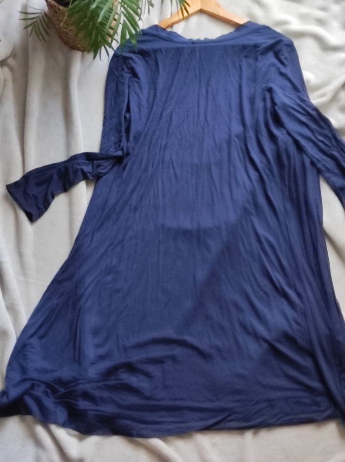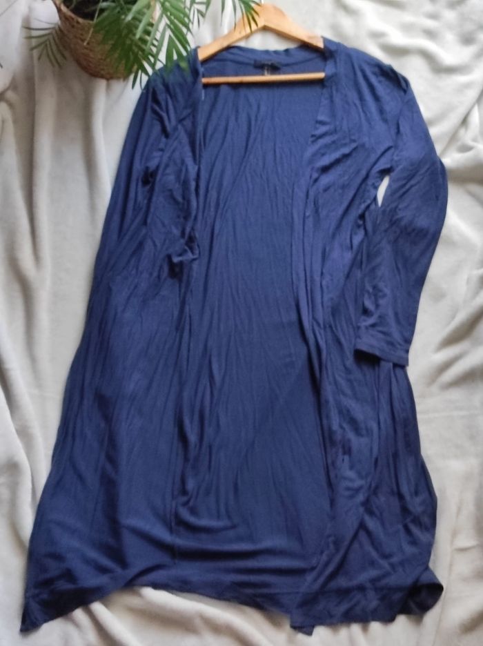 long gilet / cardigan à manches longues et ouvert en couleur bleu marine. Marque Jennyfer en taille L. En très bon état, ni trou tâches ou déchirures. Peu porté.