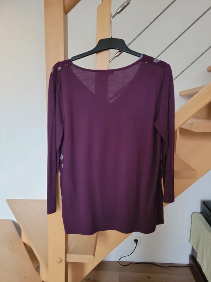 Top violet (plus foncé que sur la dernière photo) avec petites fleurs et manches 3/4. Taille 40. #ka_14vetementsfemme