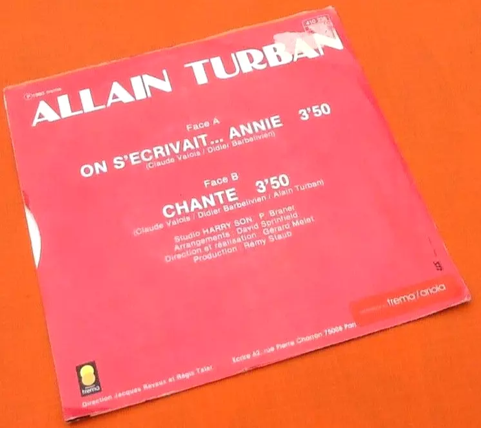 Vinyle 45 tours Allan Turban (1983) On s' écrivait ... Annie trema 410236 A On S' écrivait... Annie 4:12 Written By Claude Valois, Didier Barbelivien B Chante 3:59 Written By Alain Turban, Claude Valois, Didier Barbelivien