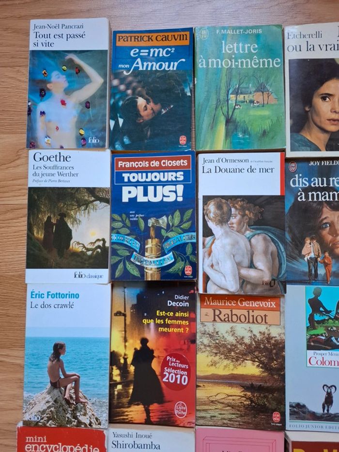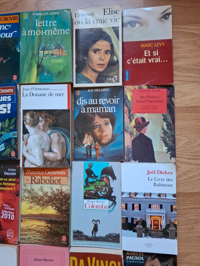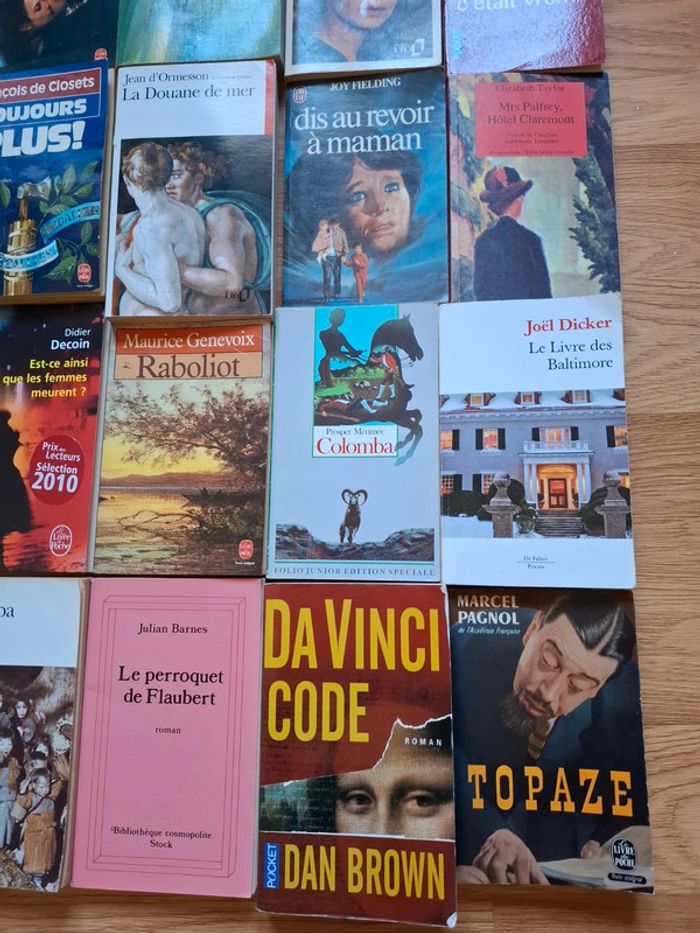 Titres aux choix 1 euro Le dos crawlé Eric Fottorino Toujours plus François de Closets Da Vinci Code Dan Brown Le perroquet de Flaubert Julian Barnes Colomba Prosper Mérité Topaze Marcel Pagnol Shirobamba Yasushi Inoué Le livre des Baltimore Joël Dicker Mrs Palfrey,hôtel Claremont Élisabeth Taylor Dis au revoir à maman Joy Fielding Élise ou la vrai vie Etcherelli Lettre à moi même F Mallet Joris Et si c était vrai Marc Levi Est ce ainsi que les femmes meurent Didier Decoin Raboliot Maurice Genevoix Mini encyclopédie de la vie pratique La douane de mer Jean d Ormesson e= mc2 mon amour Patrick Cauvin Tout est passe si vite Jean Noël Pancrazi Les souffrances du jeune Werther Goethe #clementine13430livres #lotlivres #lotslivres