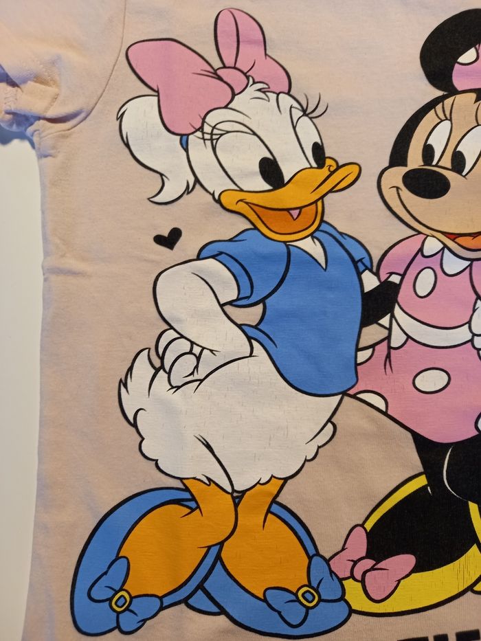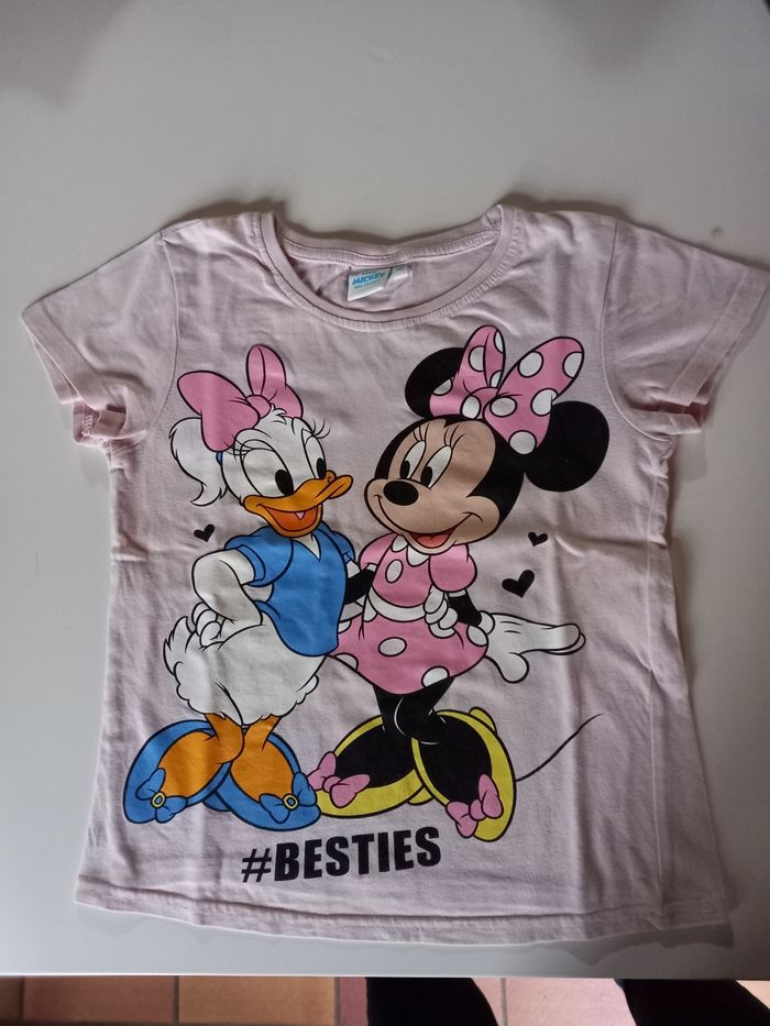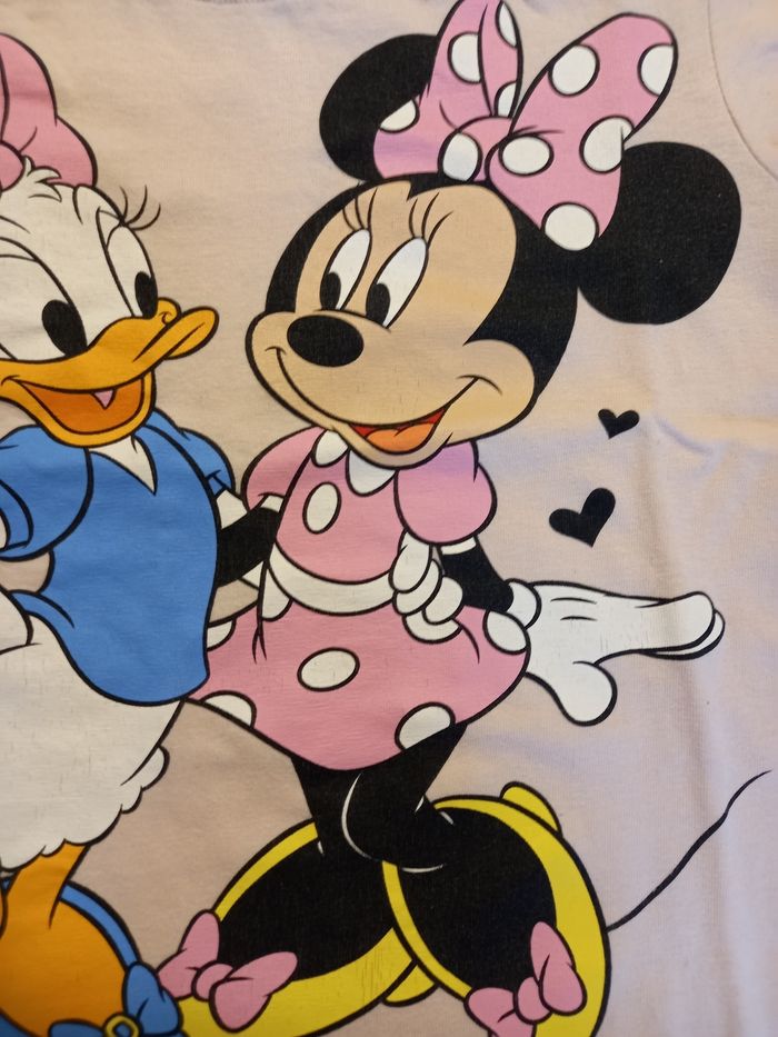 Tee-shirt Minnie et Daisy rose claire, taille 116cm. Le dessin n'a quasiment rien, à juste un petit point de couture à l'avant en bas. (Voir les photos)
