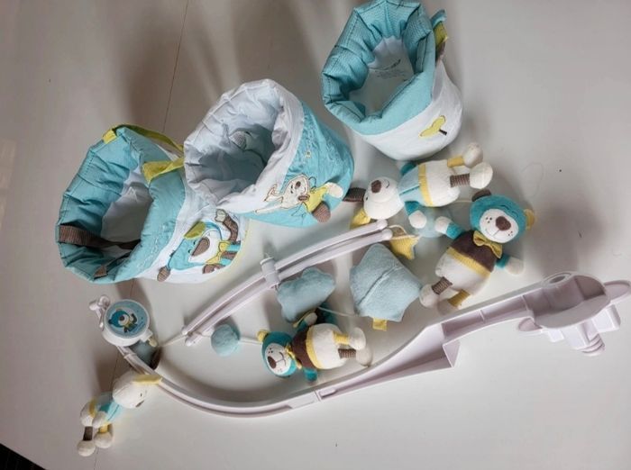 Tour de lit,matelas à langer ,tapis d'éveil, toise collection Nattou 3 paniers collection Paddy . Tout est en très bon état.. Sans le mobile il a étais vendu
