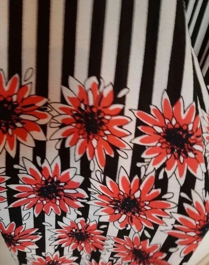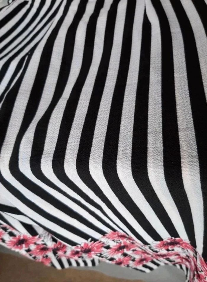 Pantalon fluide noir et blanc/blanc cassé avec fleurs fuchsias. Voir dernière photo pour la matière et couleurs. Taille M. Tirette sur le côté. Ample. Pas porté. Je le vends au prix de 12 euros. #TailleM38marine