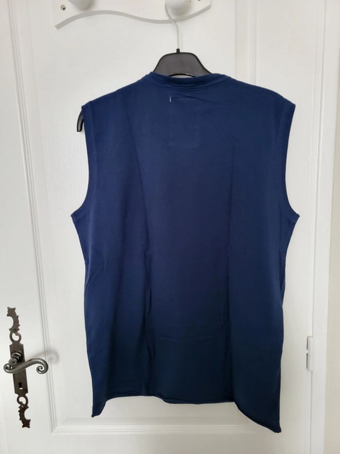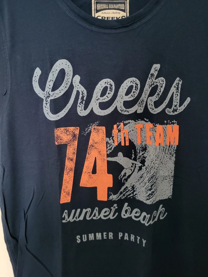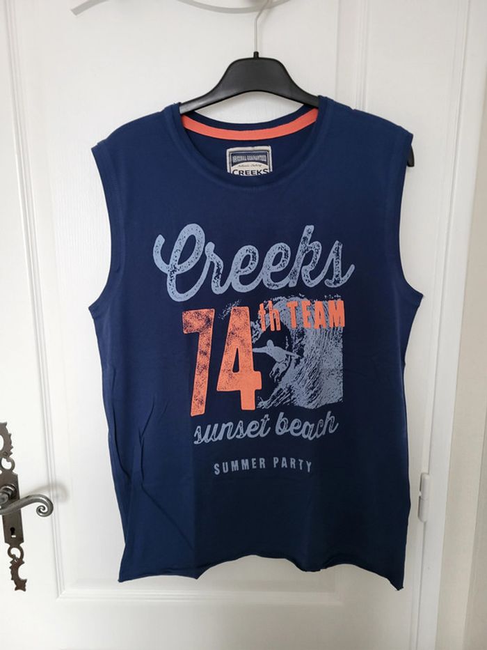 Débardeur Creeks Bleu marine avec écriture bleu et orange 74th team Sunset beach, summer party Taille L #SILVVêtementsHtL