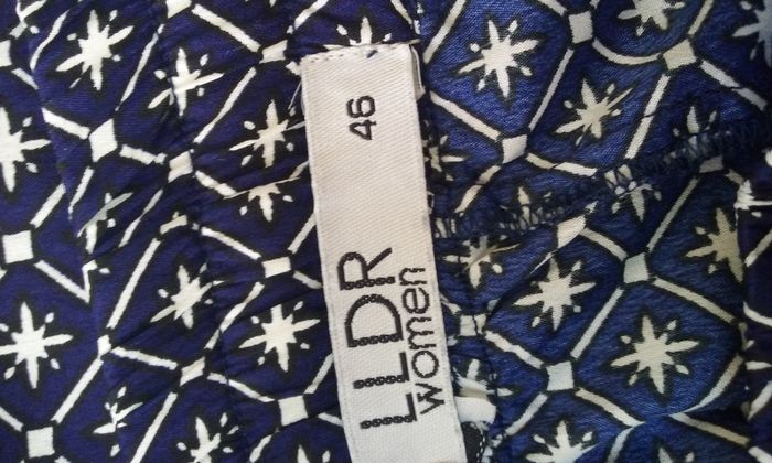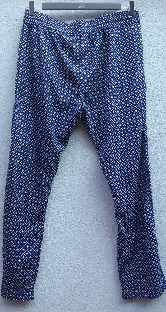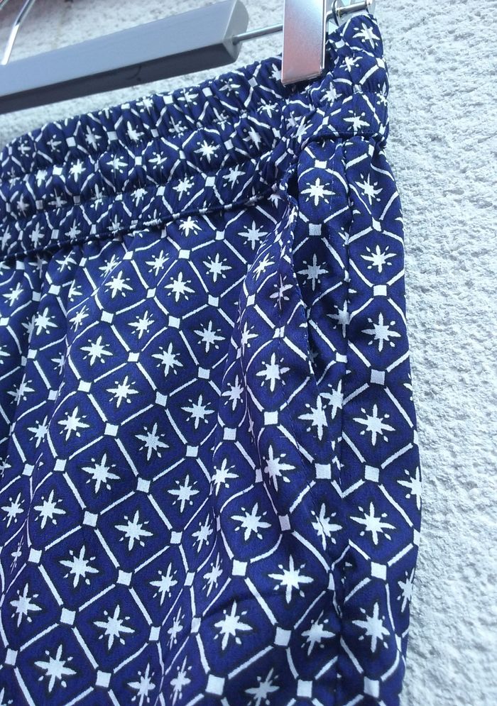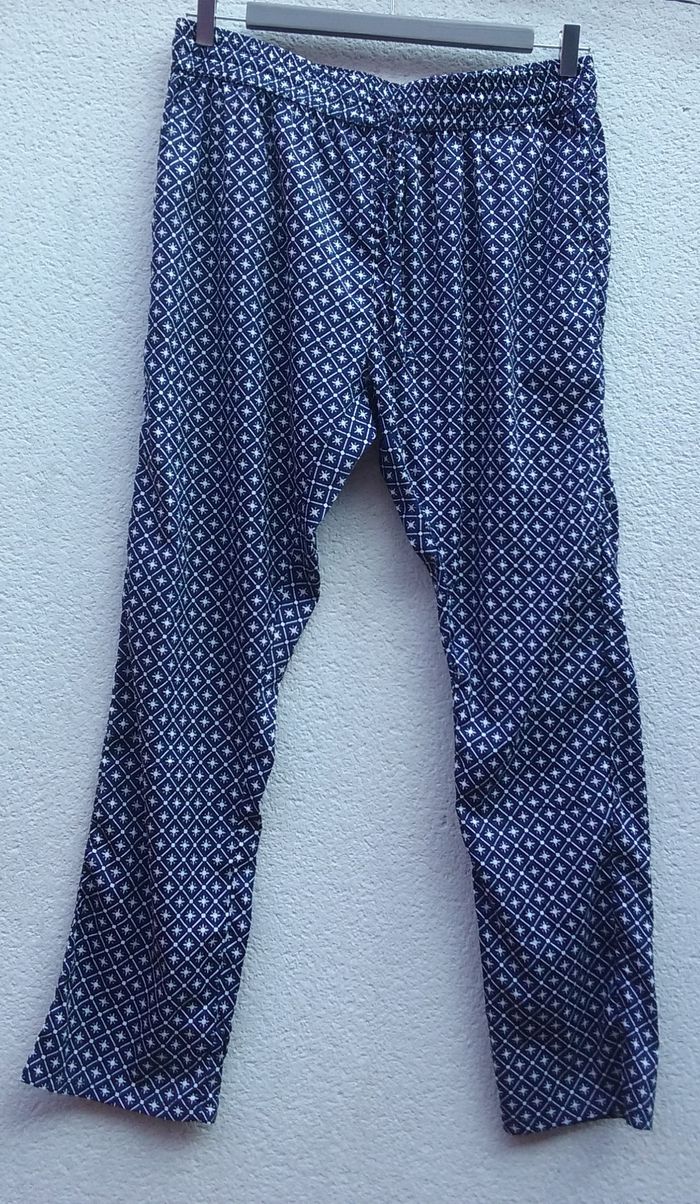 Pantalon fluide, ceinture élastiquée avec cordon de serrage, 2 poches, bleu marine et blanc.