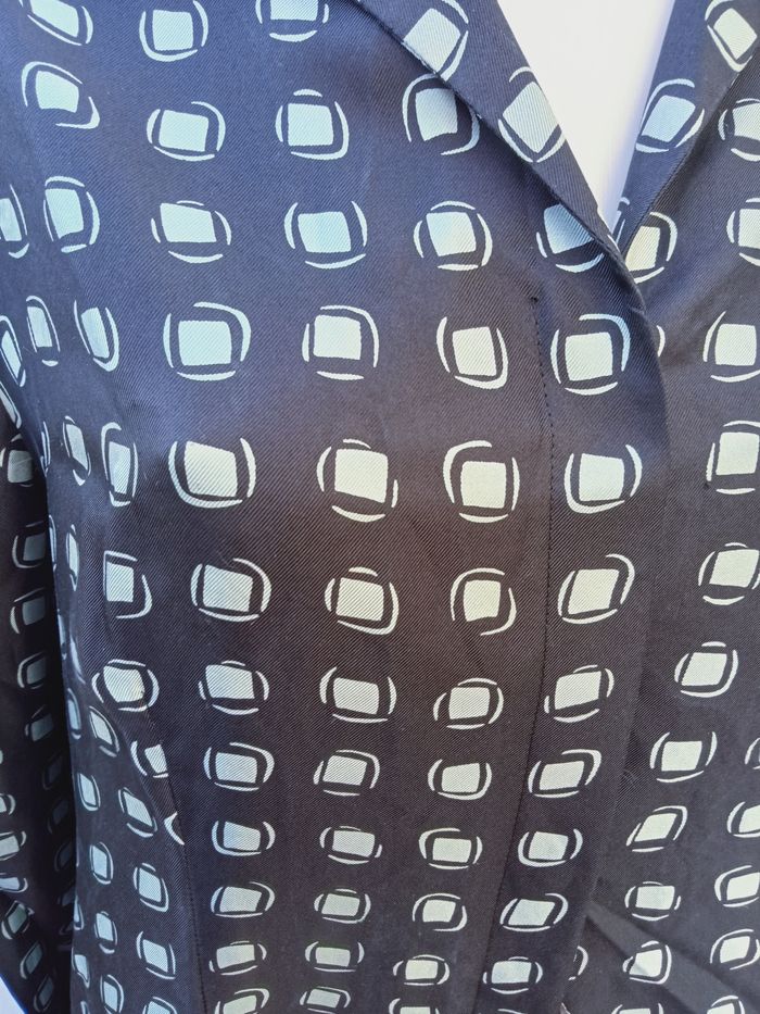 chemisier en soie bleu foncé a impression bleu argenté.aisselles a aisselles 55 cm, épaules 43 cm, Hauteur 62 cm. Tbe.