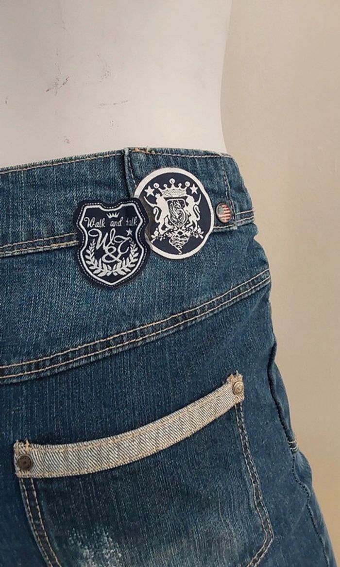 Jupe en jean T 36 Coton et élasthane 2 poches devant et derrière, passants pour ceinture 2 Écussons fantaisie derrière Longueur 40 cm #legrenierdeprovence36