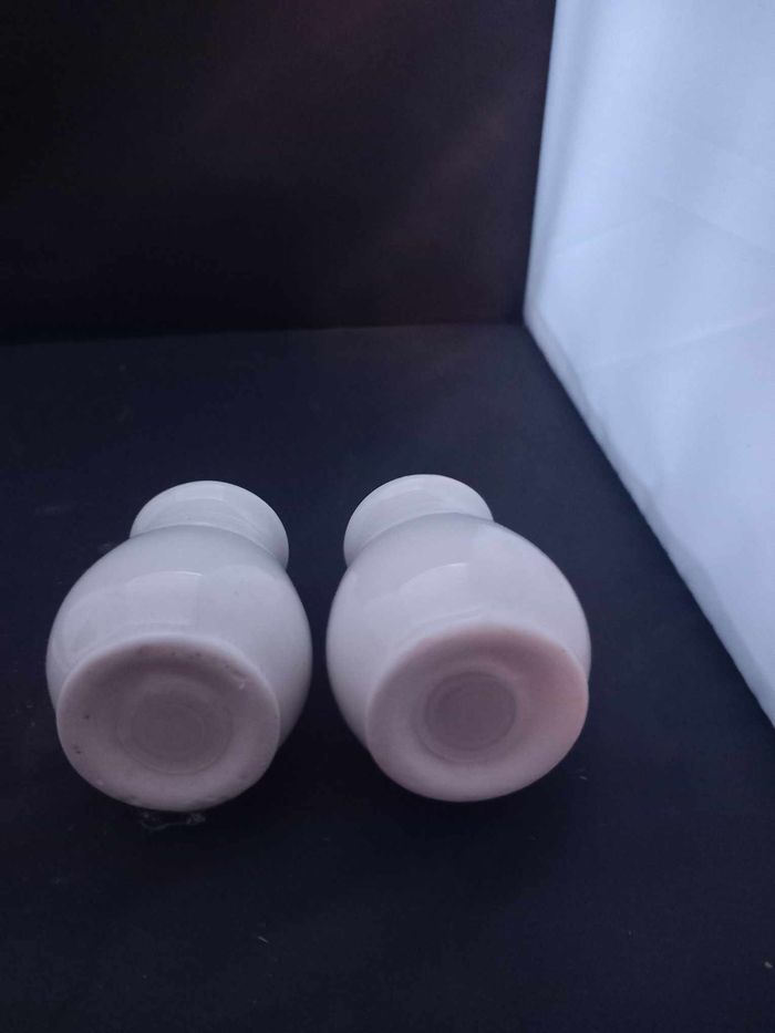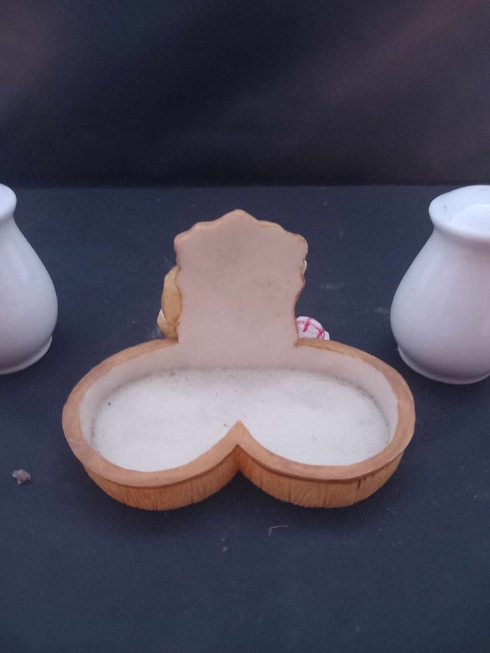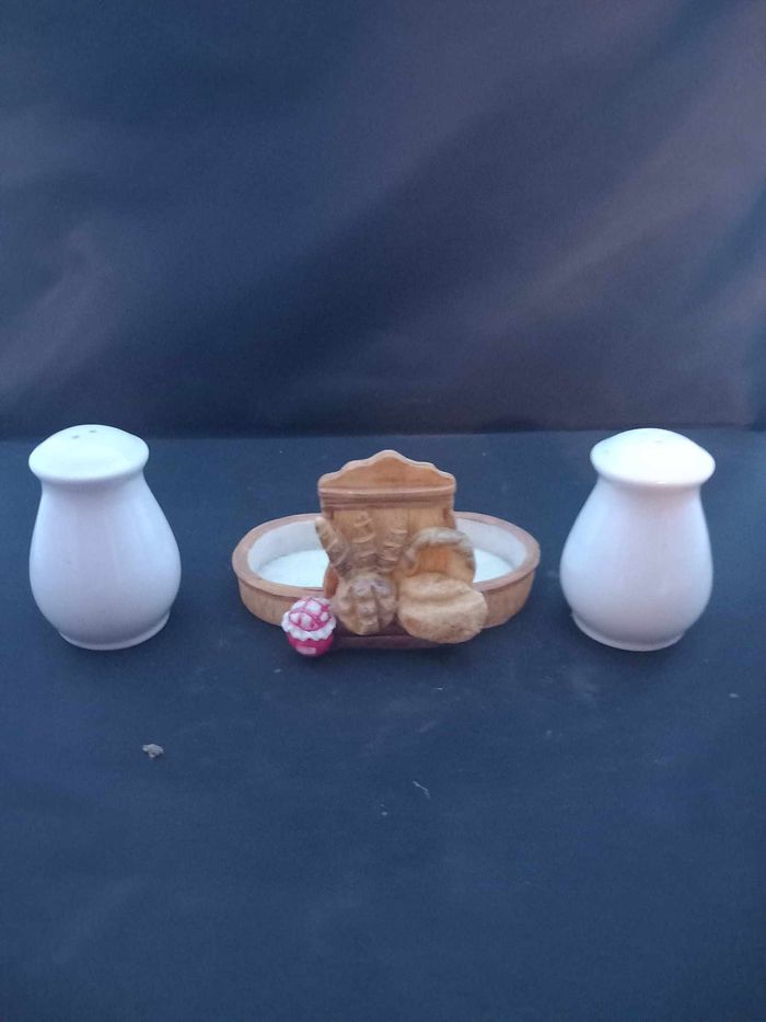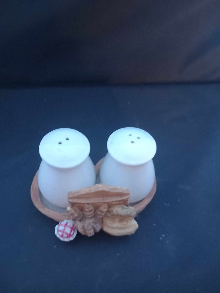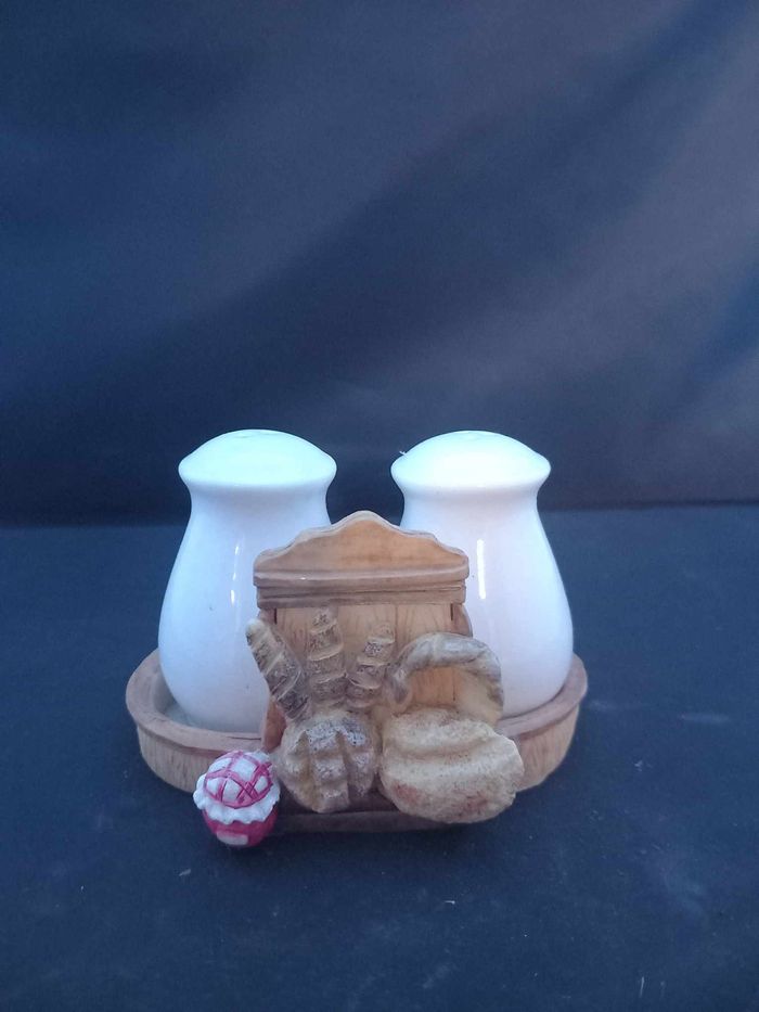 Ensemble salière et poivrier avec support Matière céramique Motifs pains et confiture Couleurs blanc, jaune, marron et rouge En très bon état Dimensions approximative 7cm de haut : 11cm de long : 7,5cm de large