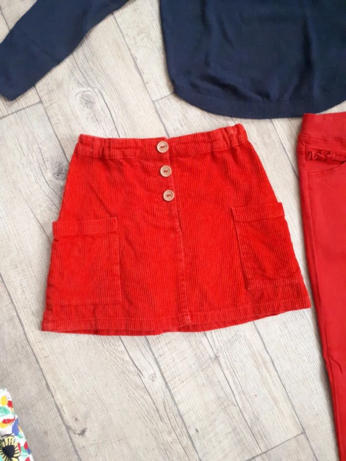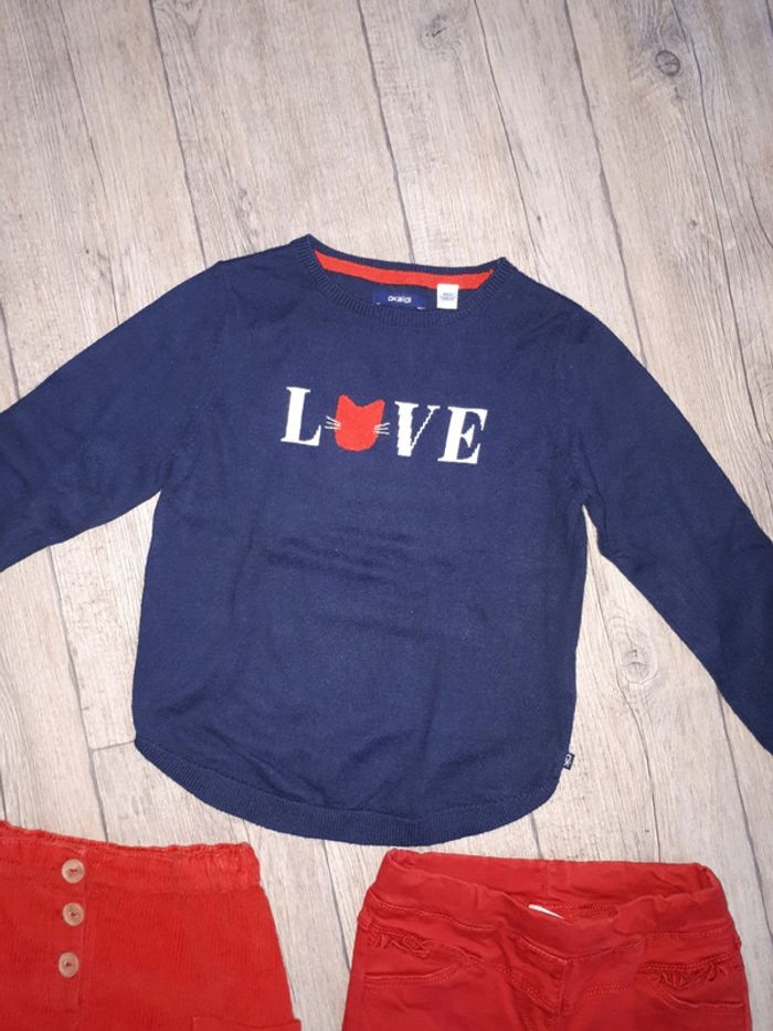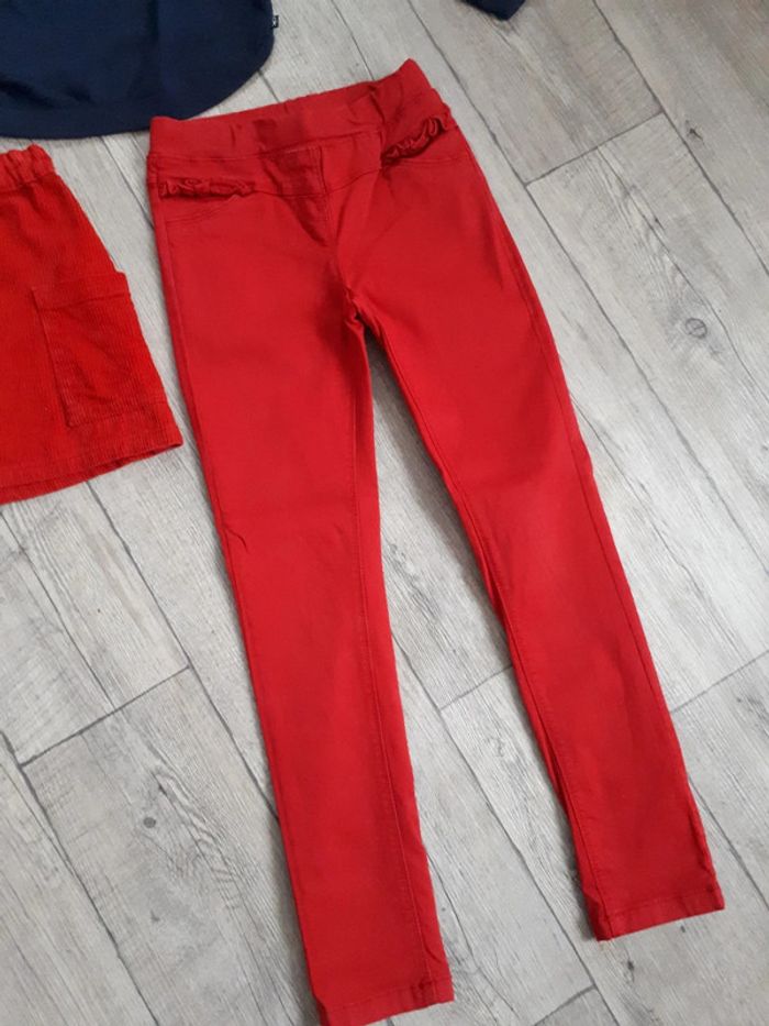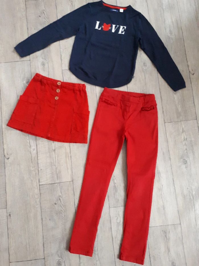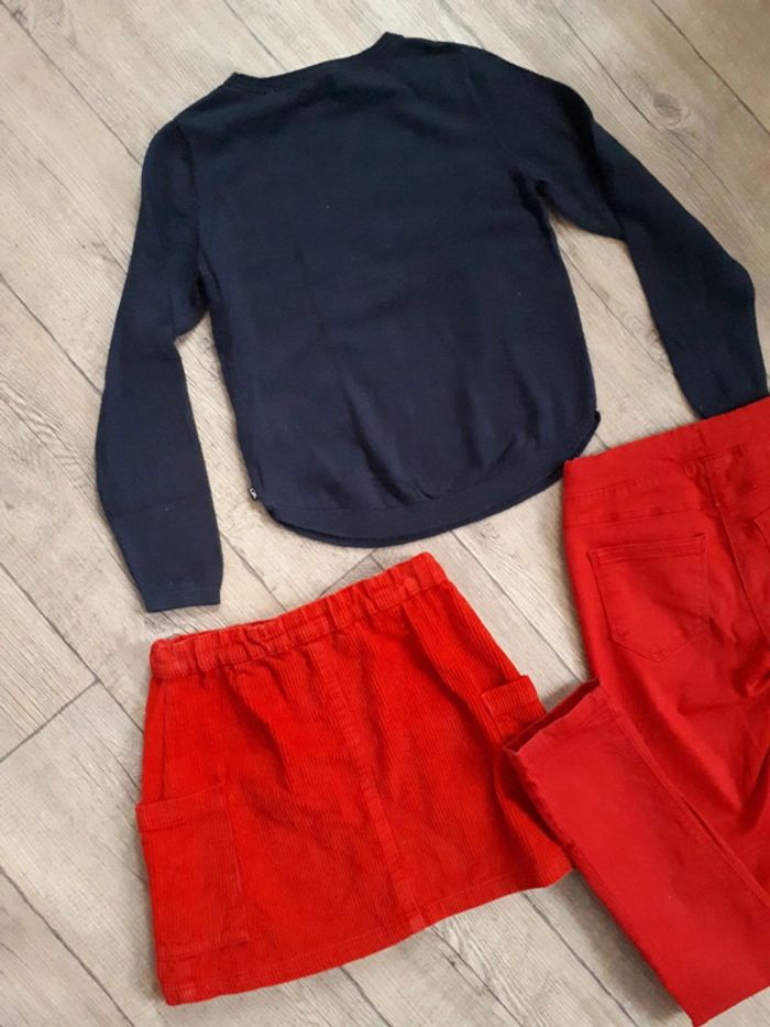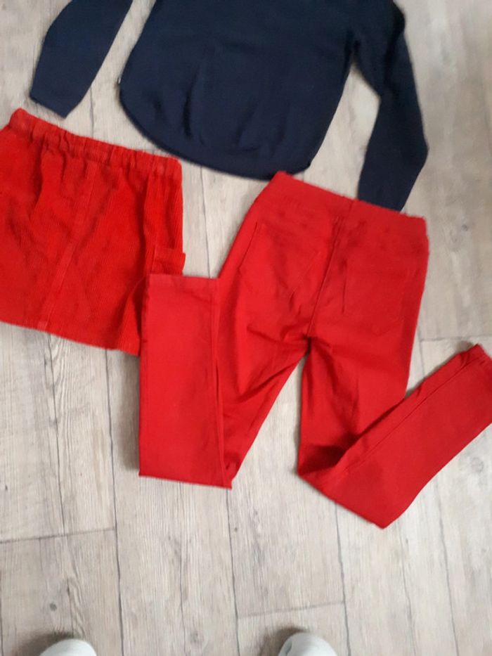 Ensemble en parfait état. Pull fin marque okaidi 8 ans Jupe en velours, rouge, fantaisie marque dpam 8 ans Pantalon style jeans rouge, fantaisie, marque tape à l oeil, taille 9 ans. Élastique pour serrer la taille si besoin.