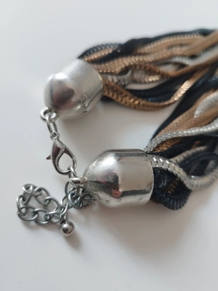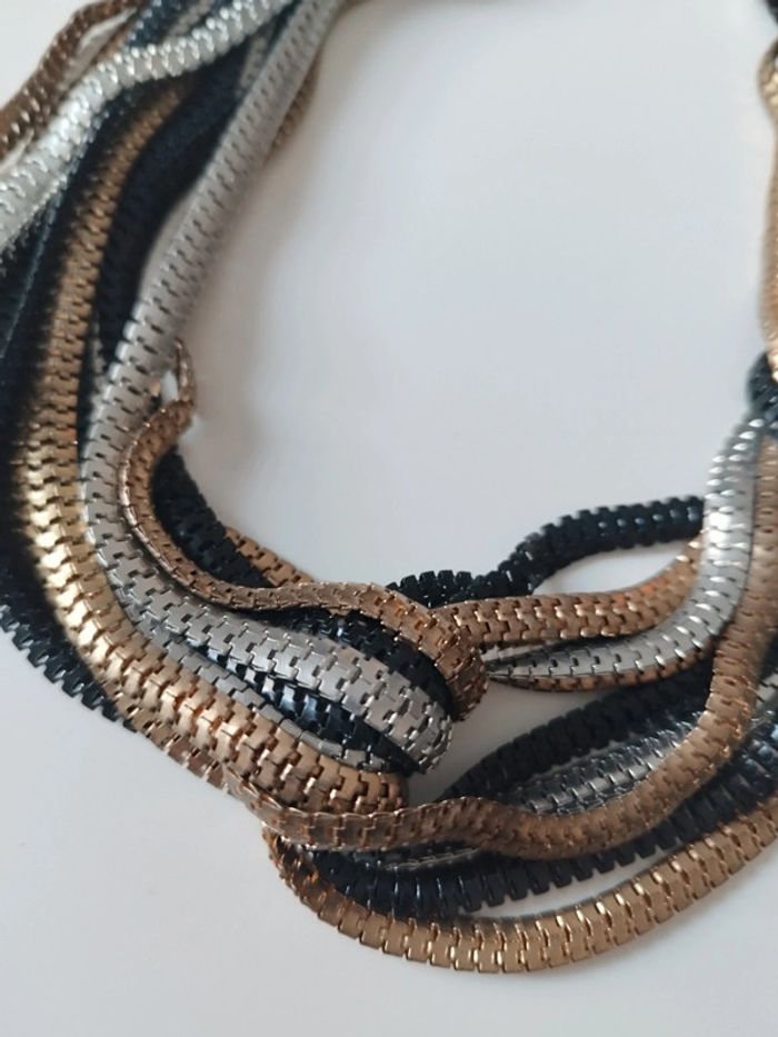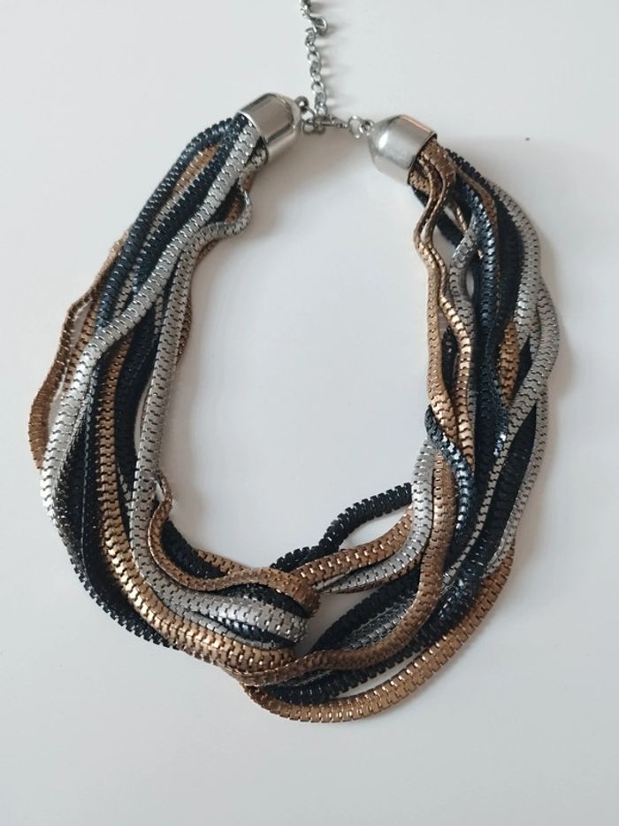 Collier multi chaine tressée ras de cou noir argenté doré fantaisie Bon état voir photos fermoir