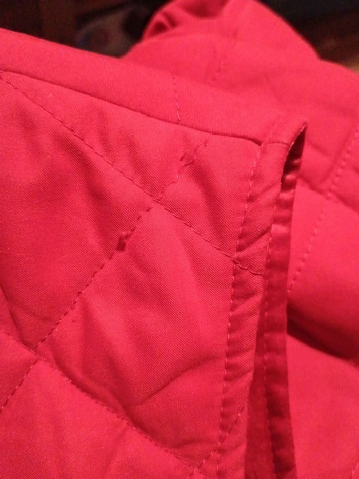 Veste rouge matelassée sans manches Taille L estimée à confirmer avec les mesures Epaules 42cm Aisselles 52cm Longueur 62cm Couture d'un matelassage un peu lâche a l'épaule gauche.