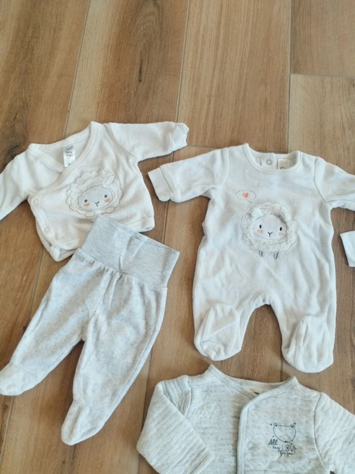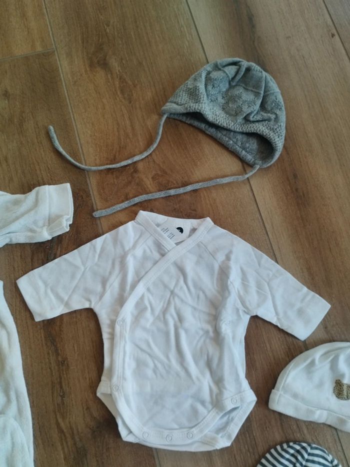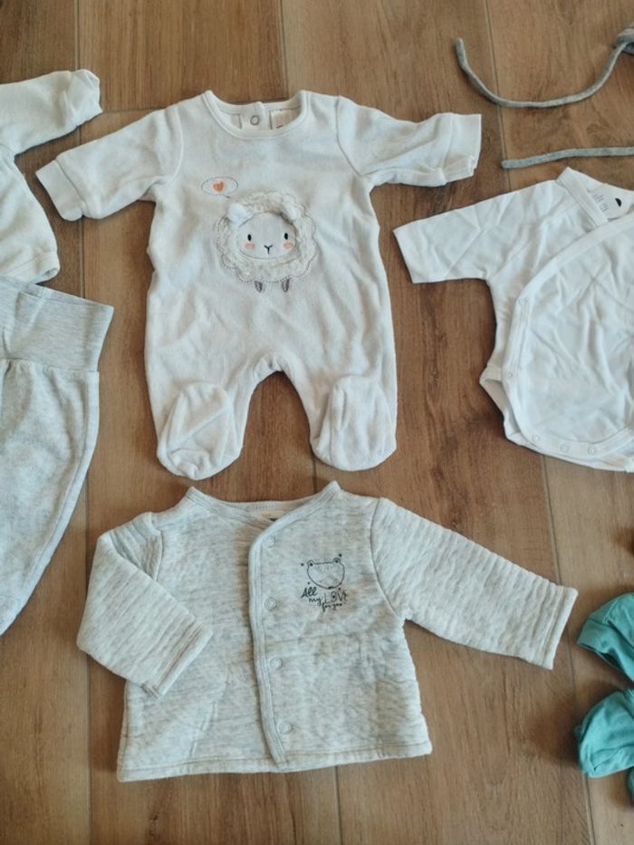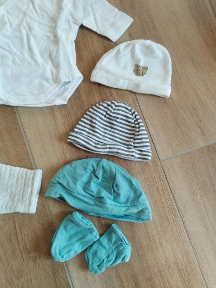 Lot comprenant : 1 pyjama velours 2 pièces 1 pyjama velours 1 pièce 1 gilet 1 body neuf 1 bonnet avec lien 3 bonnets 1 paires de moufles Taille naissance, 50cm Mixte Diverses marques