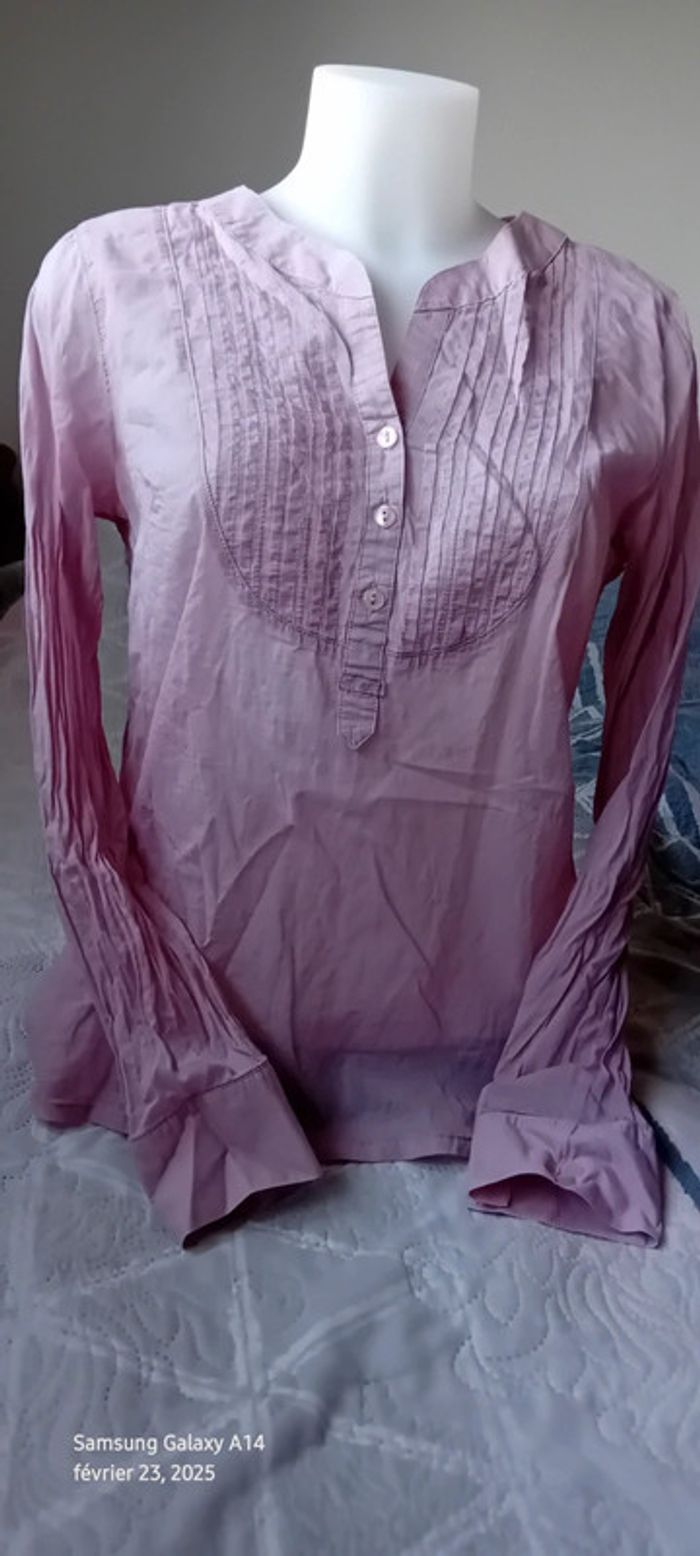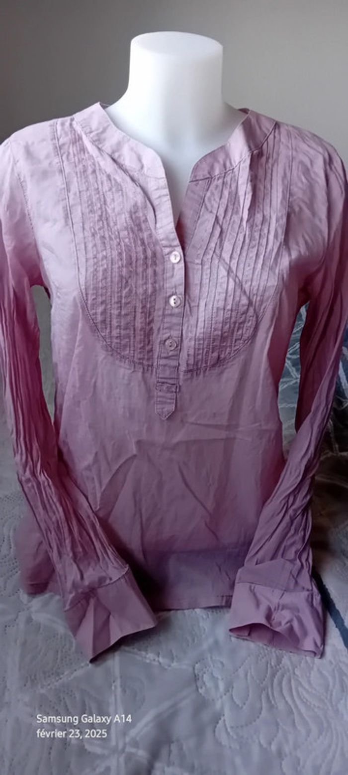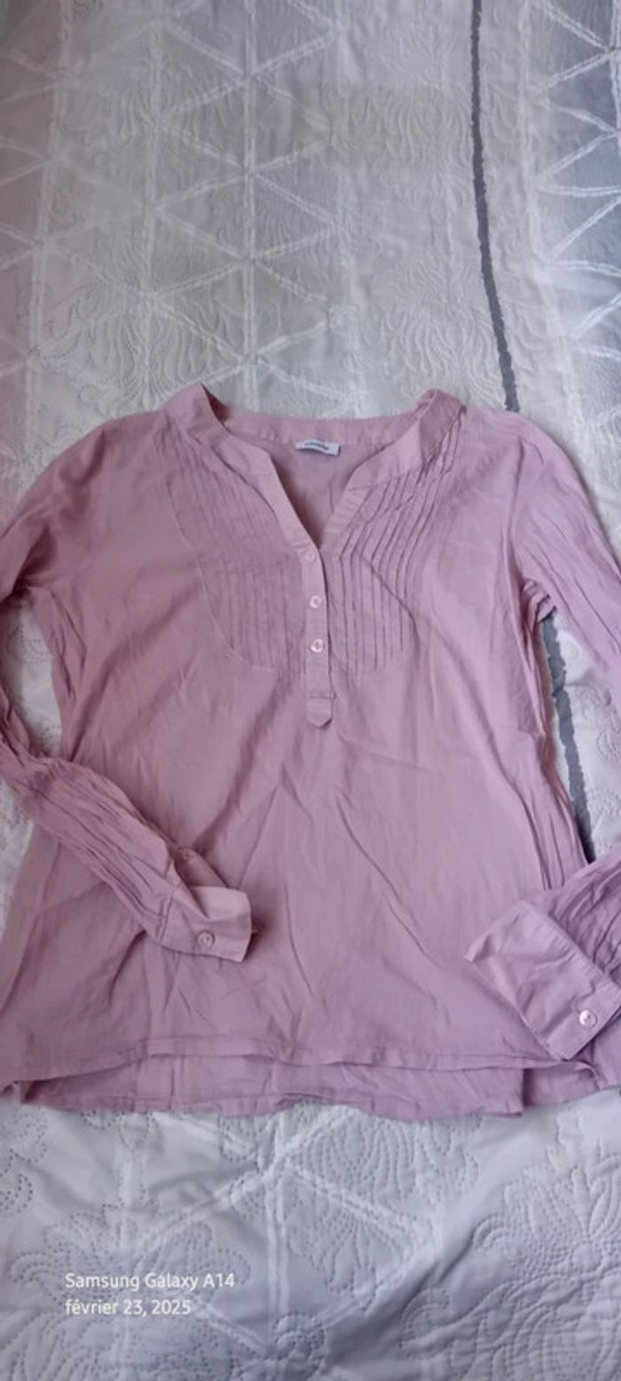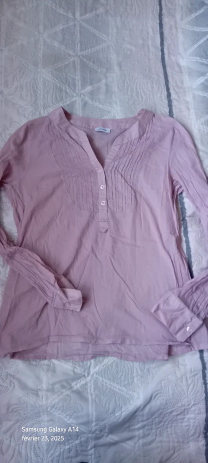 Blouse manches longues en viscose et coton matière légère semi transparente plastron plissé au décolleté avec boutons couleur vieux rose tirant sur le mauve longueur 61 cm largeur aisselles à aisselles 54 cm largeur épaules 36 cm longueur manches 60 cm correspond à un petit 42 peu portée en très bon état #midole #midolefemme #midolefemme42 #blouse #blousefemme42 #blousefemmexl #femmexl #femme42 #mauve #blouselegere42 #pimkie