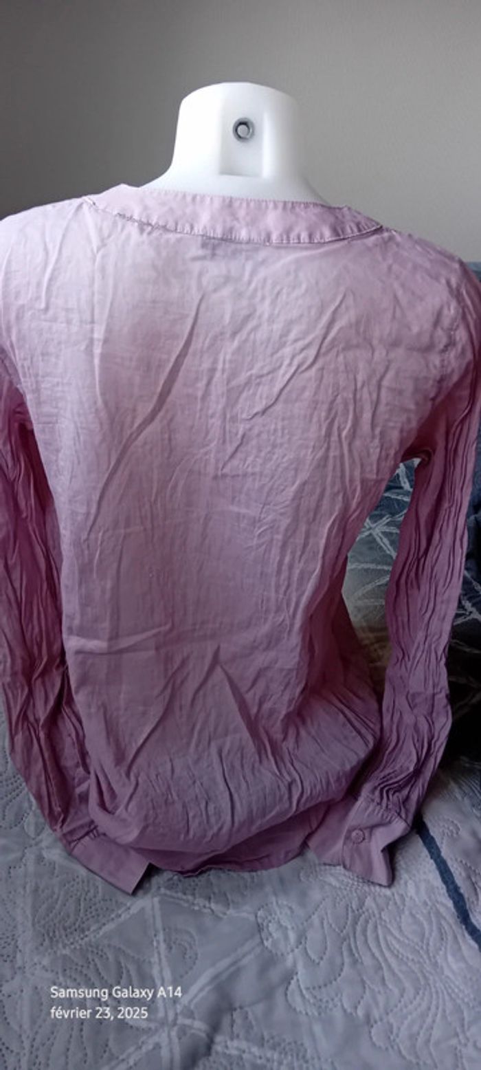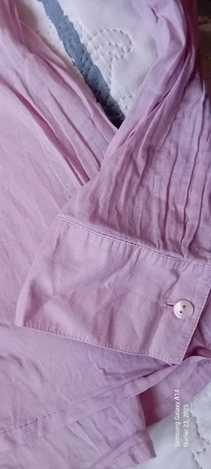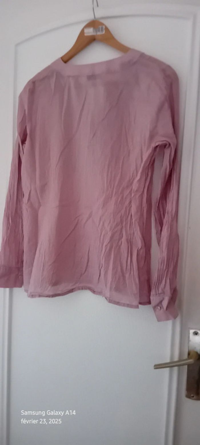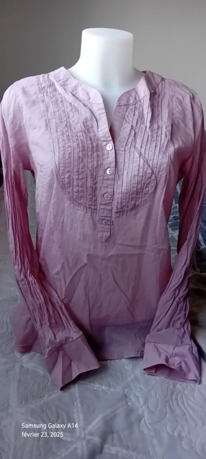 Blouse manches longues en viscose et coton matière légère semi transparente plastron plissé au décolleté avec boutons couleur vieux rose tirant sur le mauve longueur 61 cm largeur aisselles à aisselles 54 cm largeur épaules 36 cm longueur manches 60 cm correspond à un petit 42 peu portée en très bon état #midole #midolefemme #midolefemme42 #blouse #blousefemme42 #blousefemmexl #femmexl #femme42 #mauve #blouselegere42 #pimkie