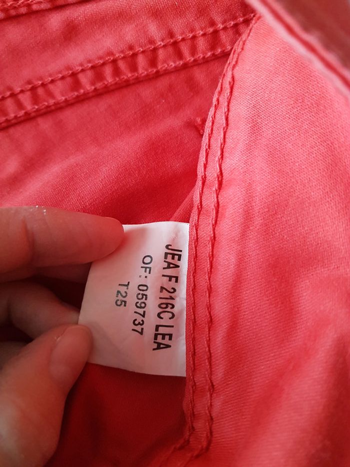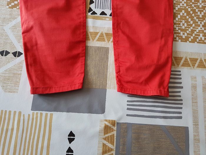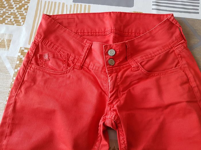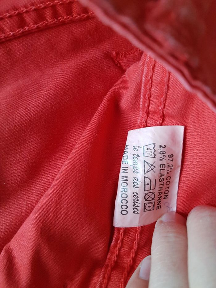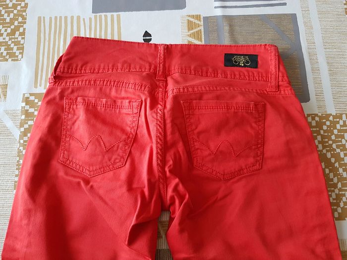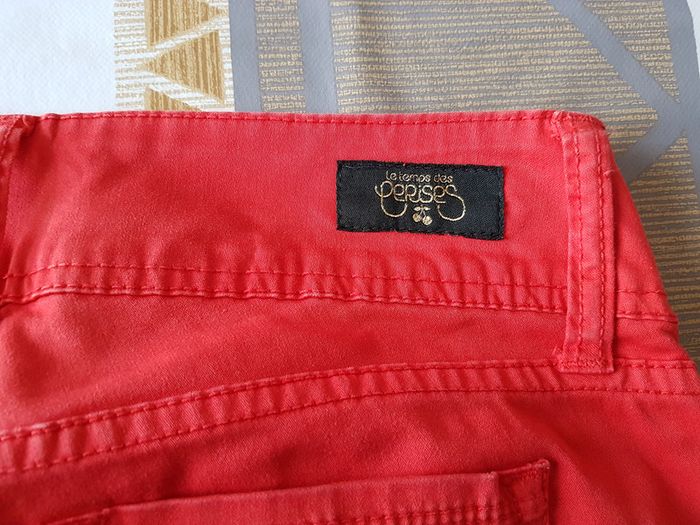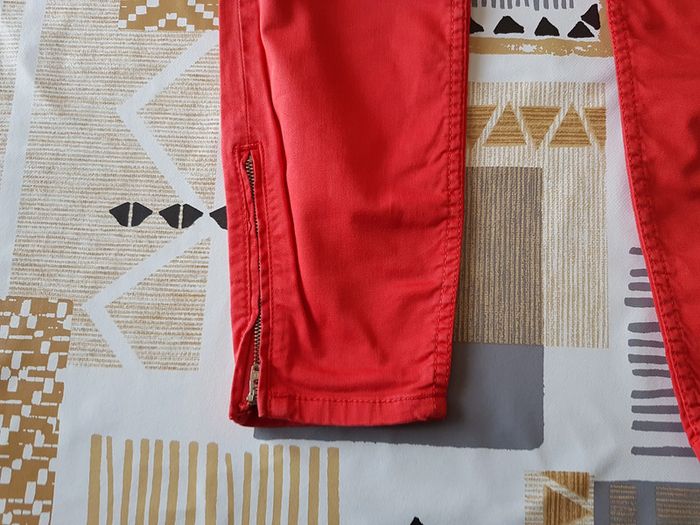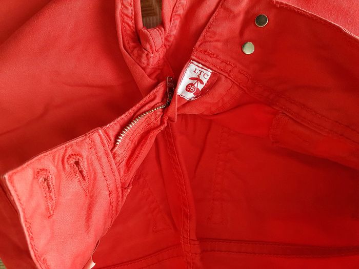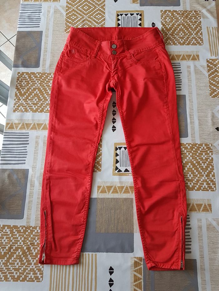 Jean rouge Le temps des cerises Taille 25 (correspond à un 34/35 français) Taille basse, jean slim, fermeture éclair au bas des jambes 2 boutons et fermeture éclair au niveau de l'entrejambe Coton, elasthanne #SILVVêtementsFtXS