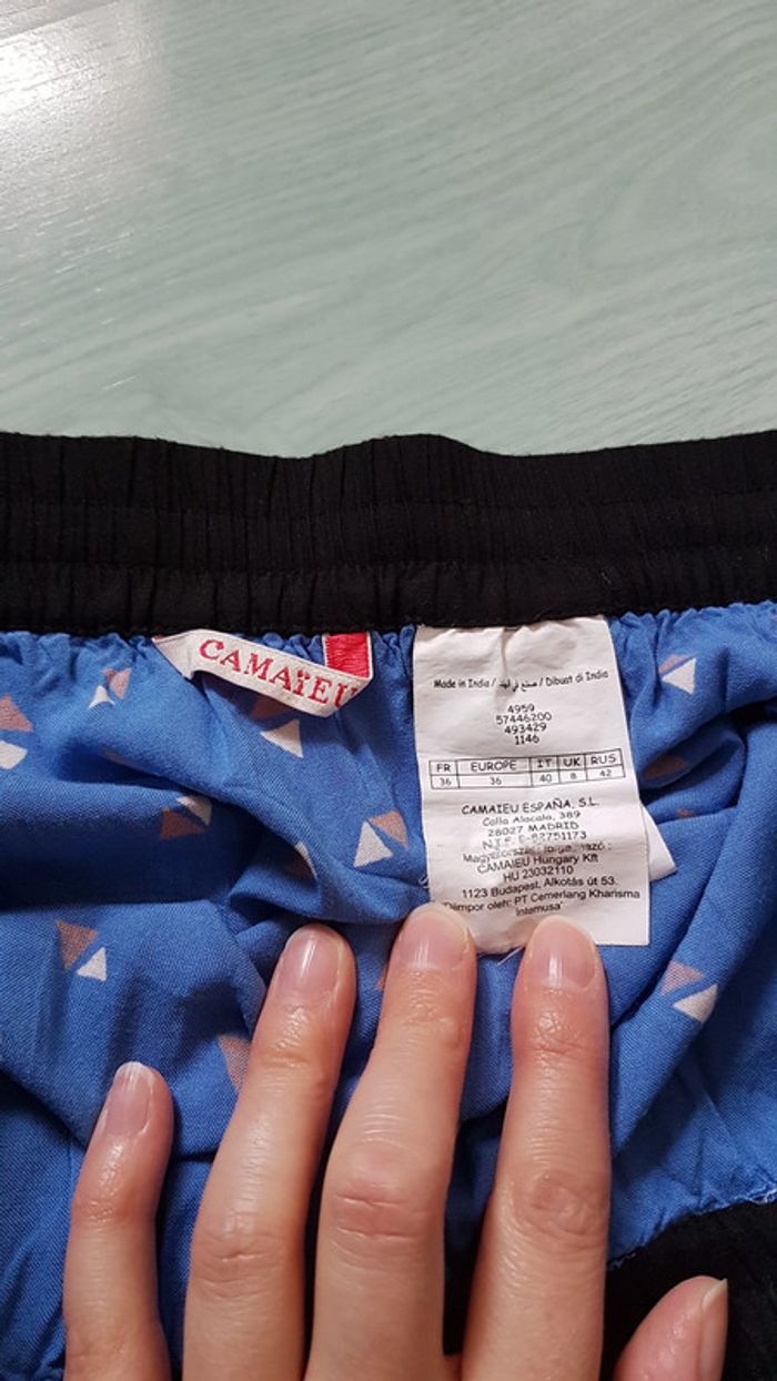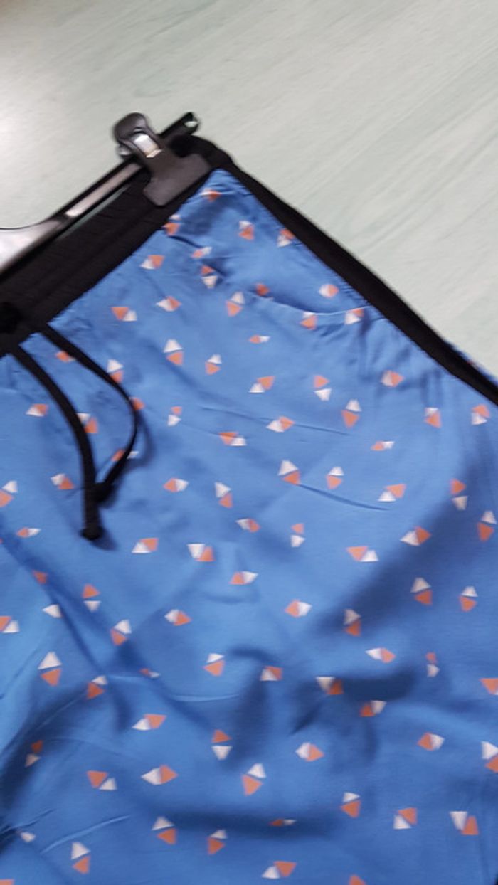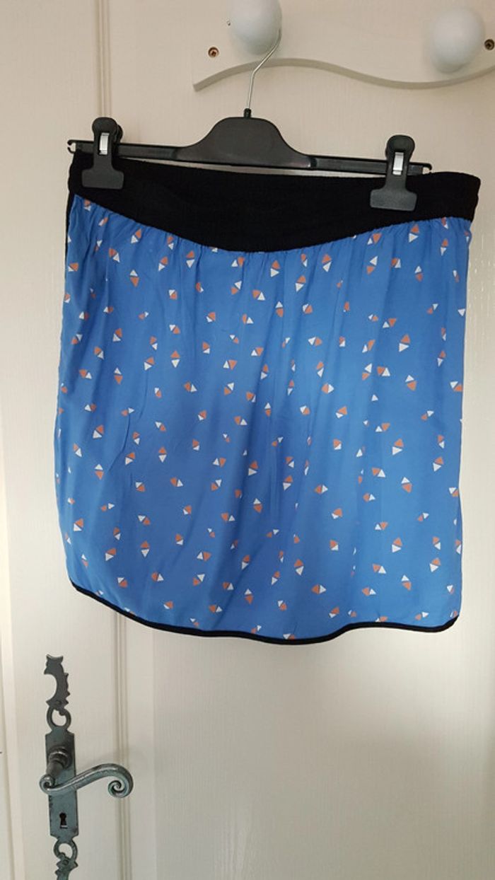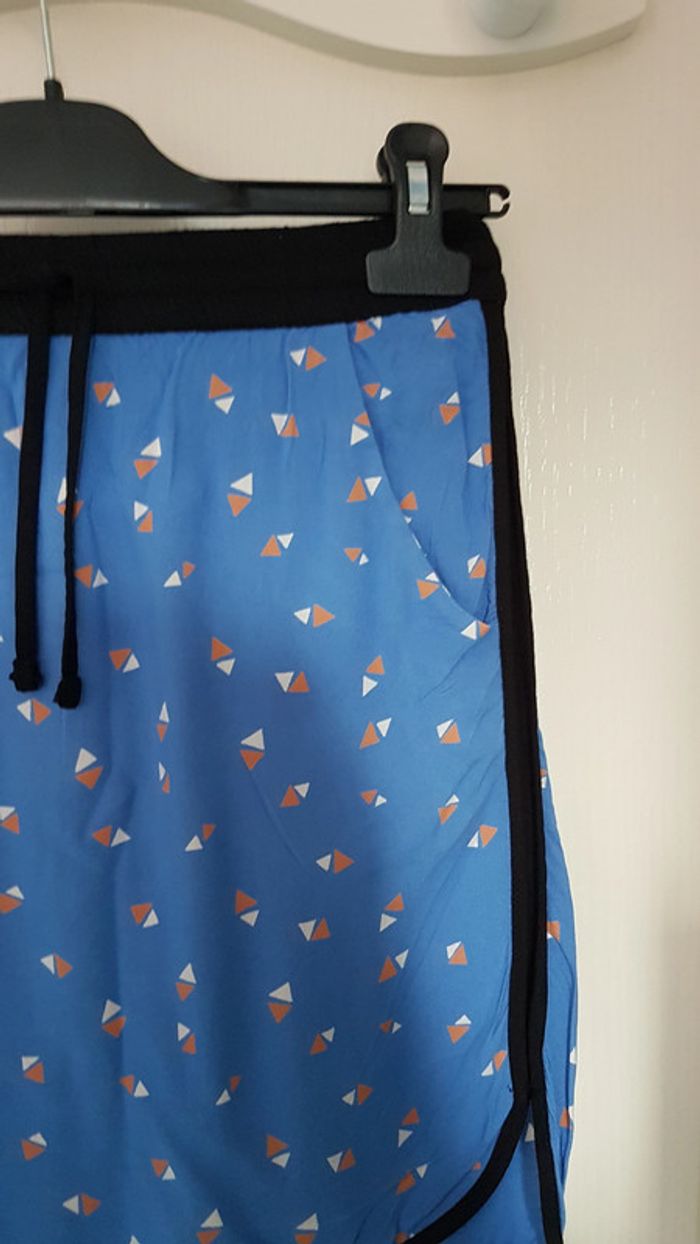 Jupe bleue motifs géométriques triangles Taille élastique avec liens Poches Camaïeu Taille 36 Viscose #SILVVêtementsFtS