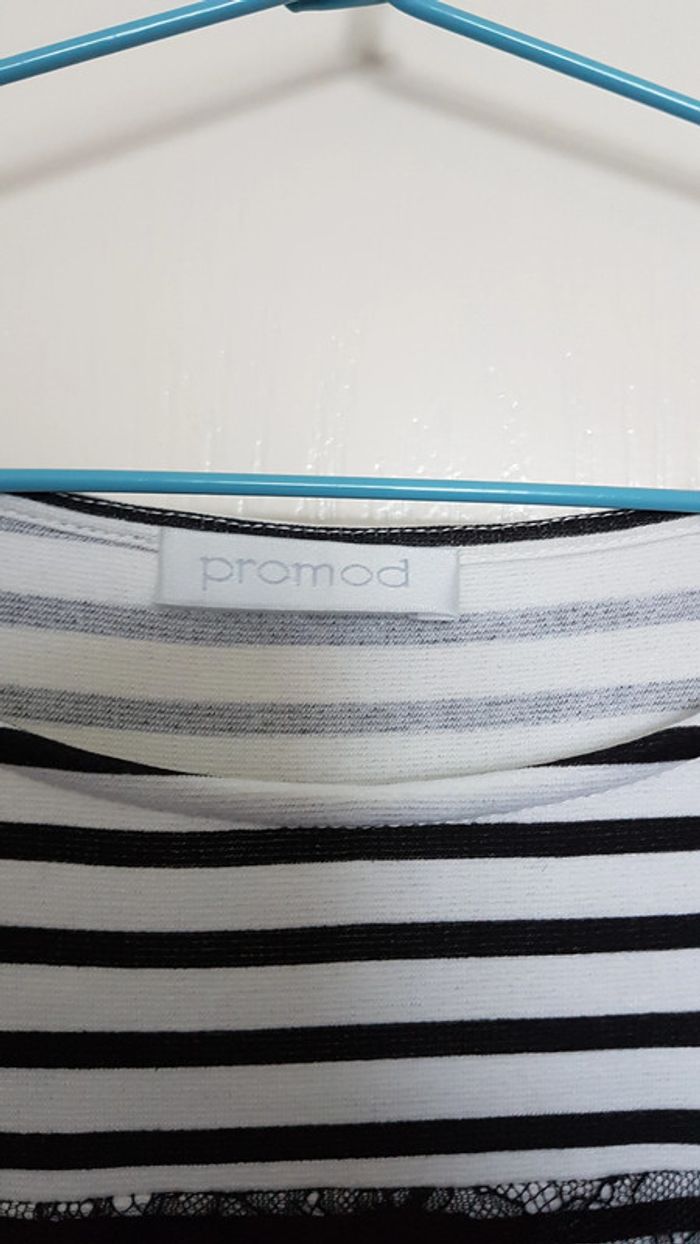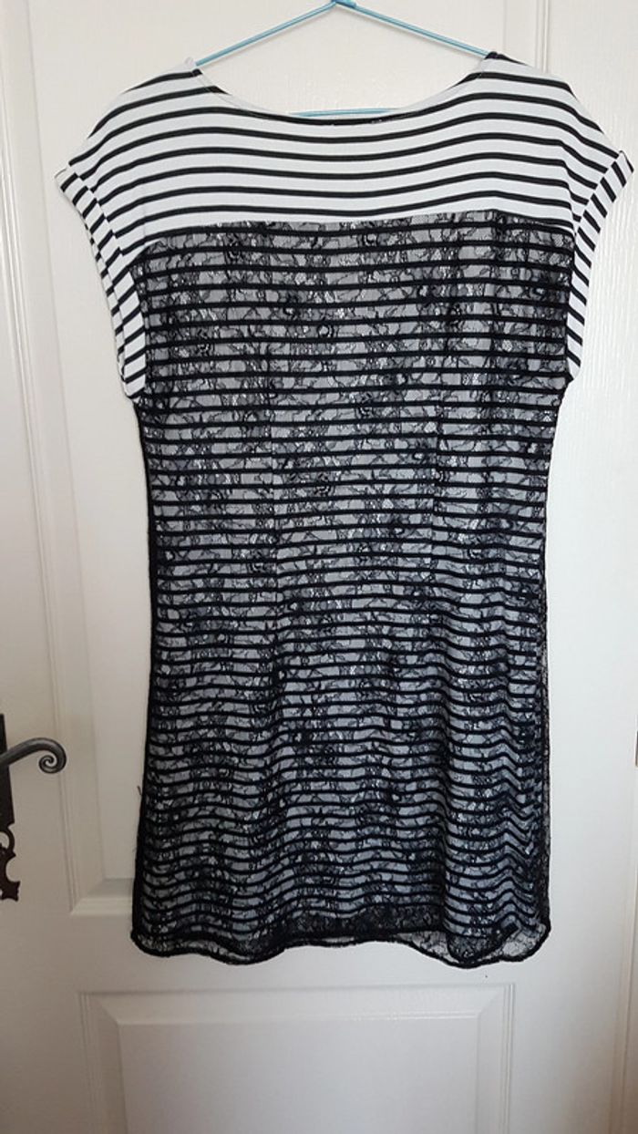 Robe Promod Blanche à rayures noires. Dentelle noire à fleurs. Etiquette intérieur coupée mais il s'agit d'une taille 40. #SILVVêtementsFtL