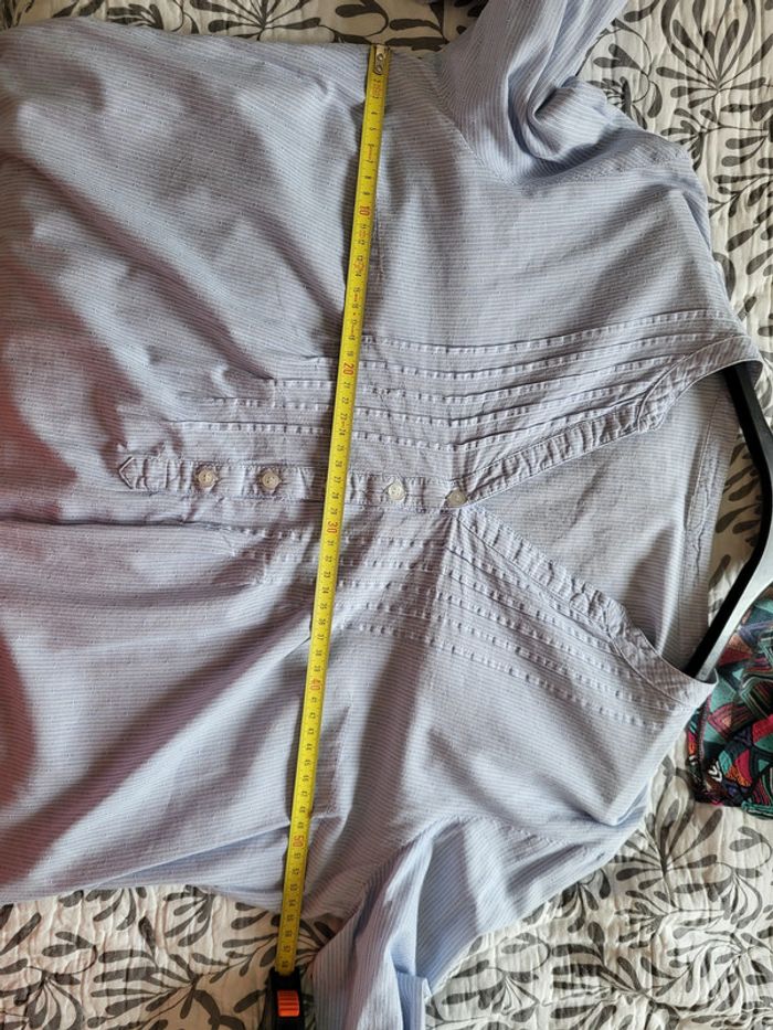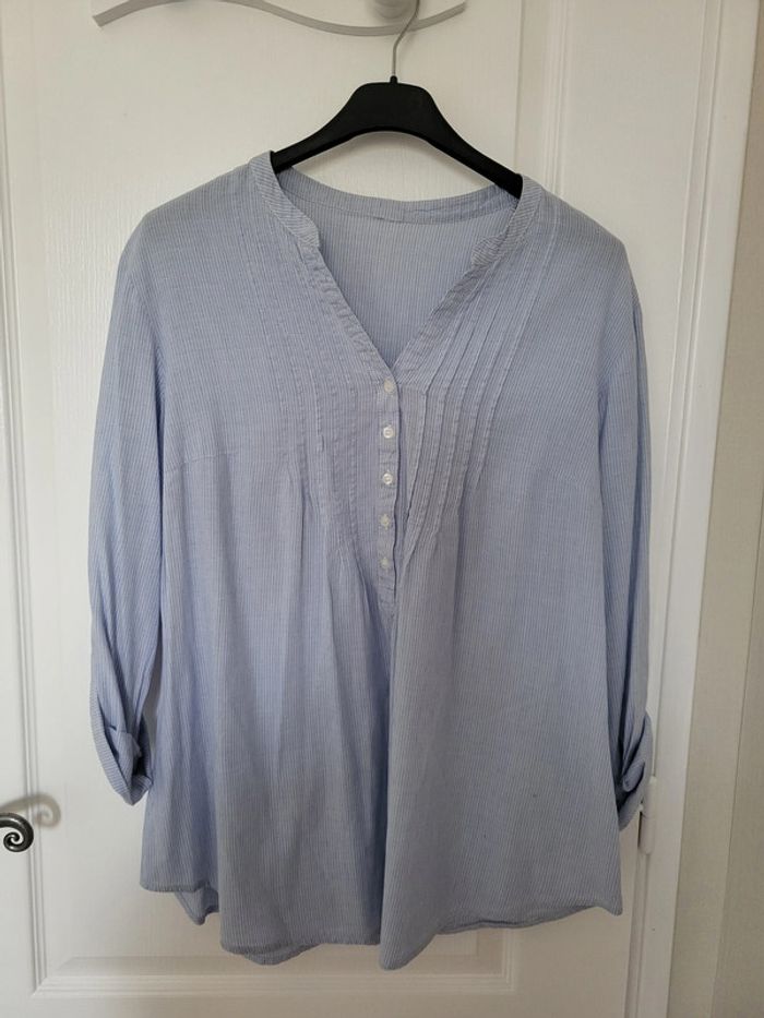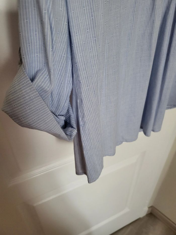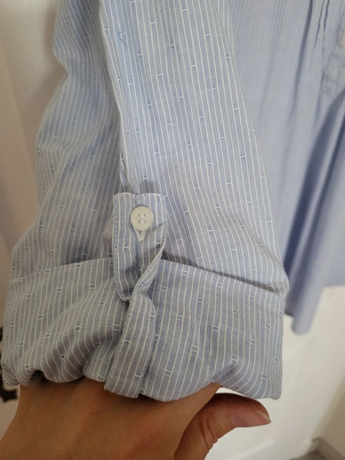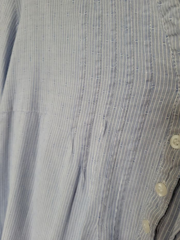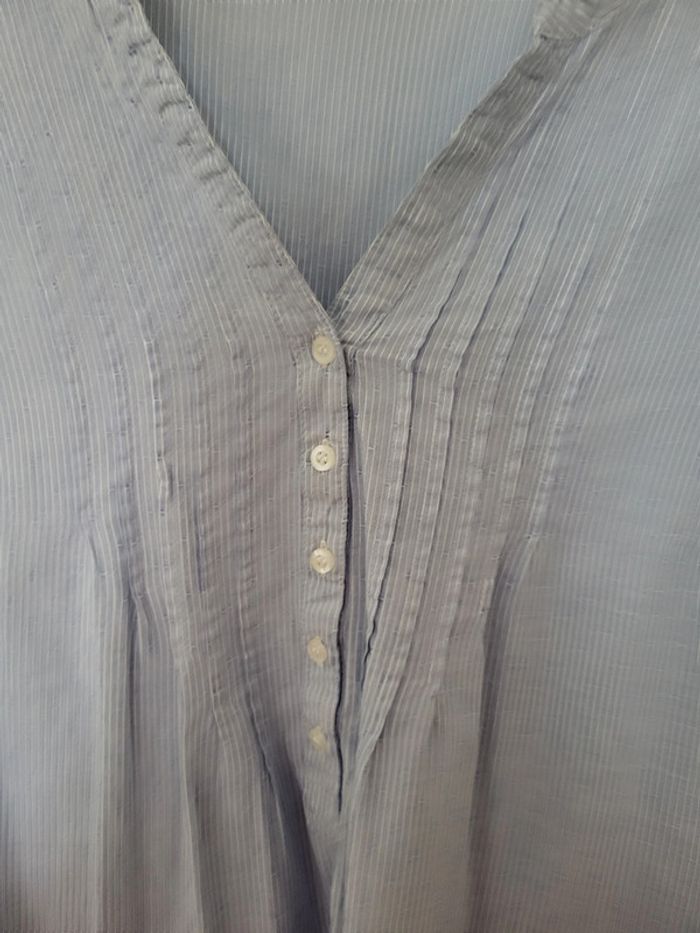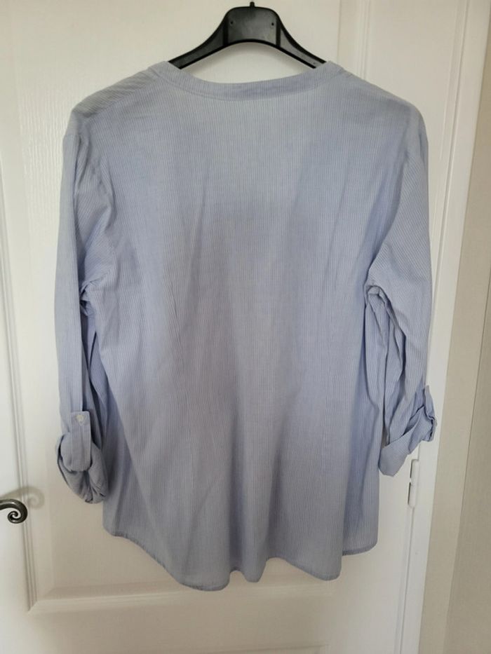 Chemise blouse bleu et blanc Camaieu Boutons sur le devant, col V avec détails Manches relevées 3/4 Etiquette coupée mais il s'agit d'une taille 4 (voir mesures sur dernière photo) #SILVVêtementsFtXL