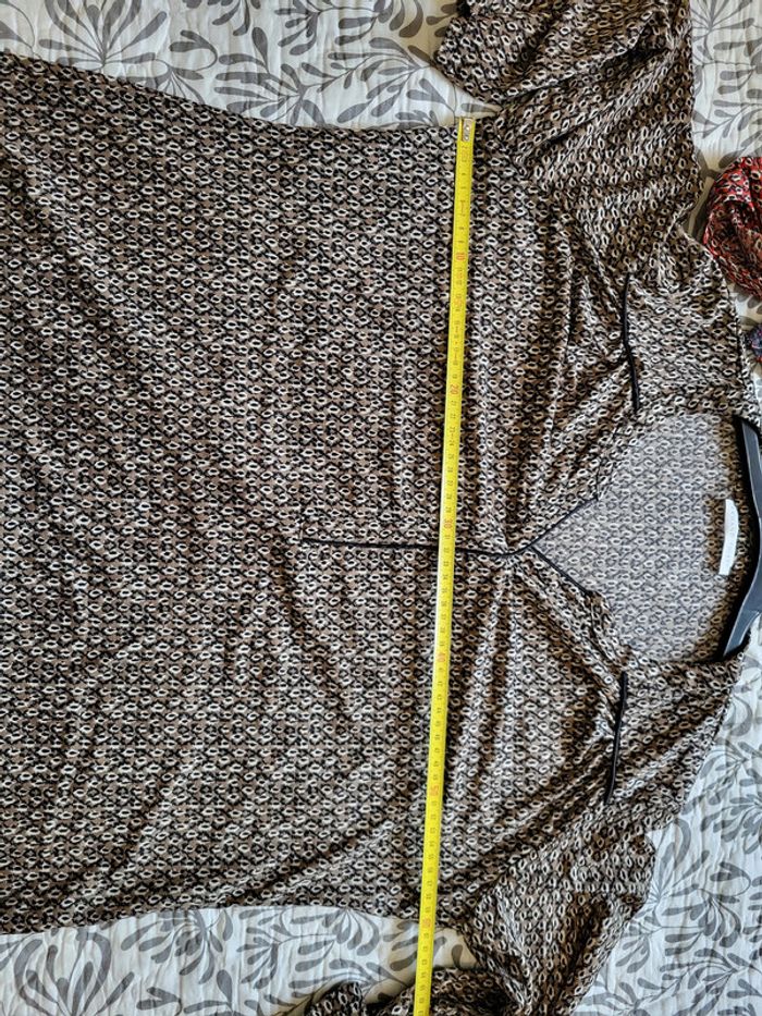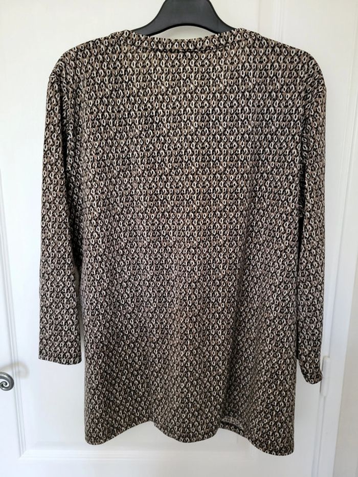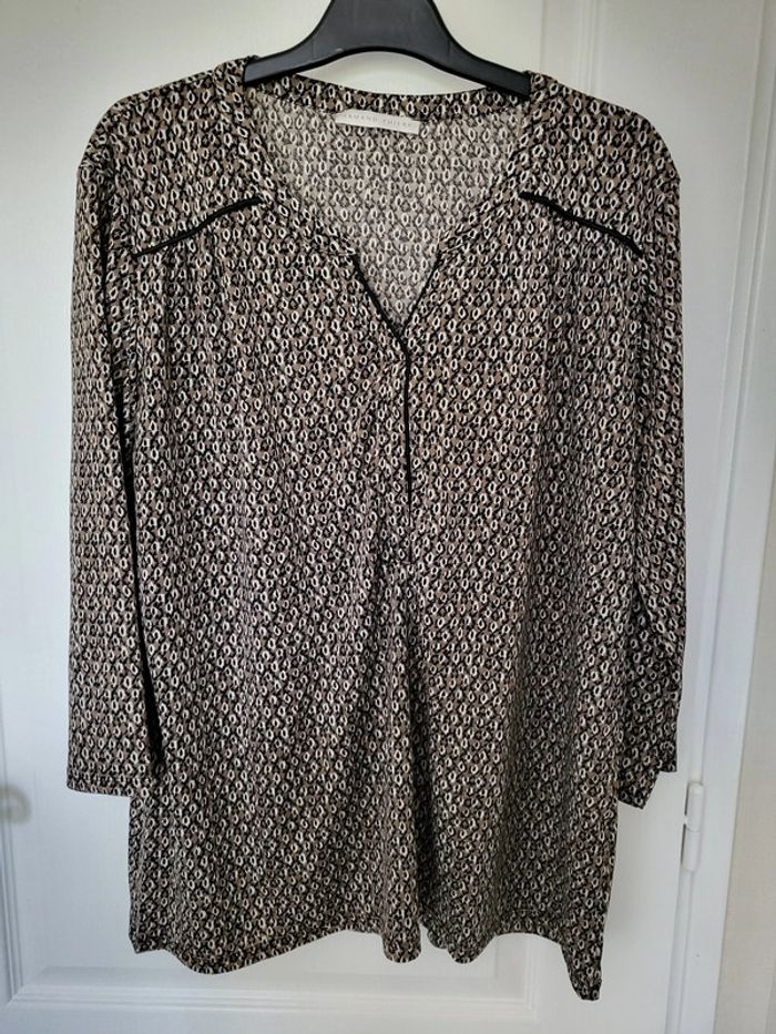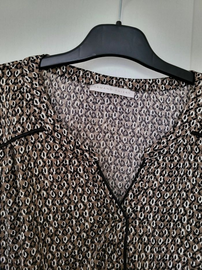 Haut fluide, motifs géométriques, marron, blanc Armand Thiery Manches 3/4, col V Etiquette coupée mais il s'agit d'une taille 4 (voir mesures sur dernière photo) #SILVVêtementsFtXL