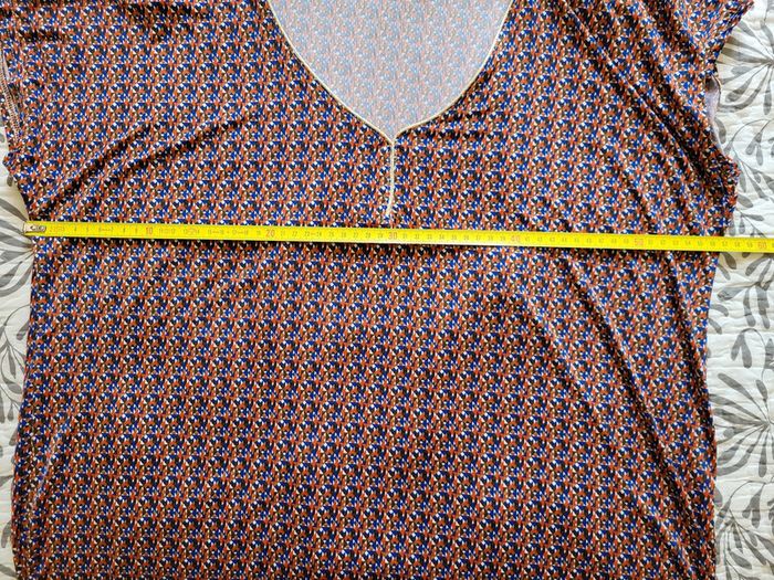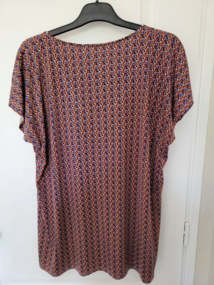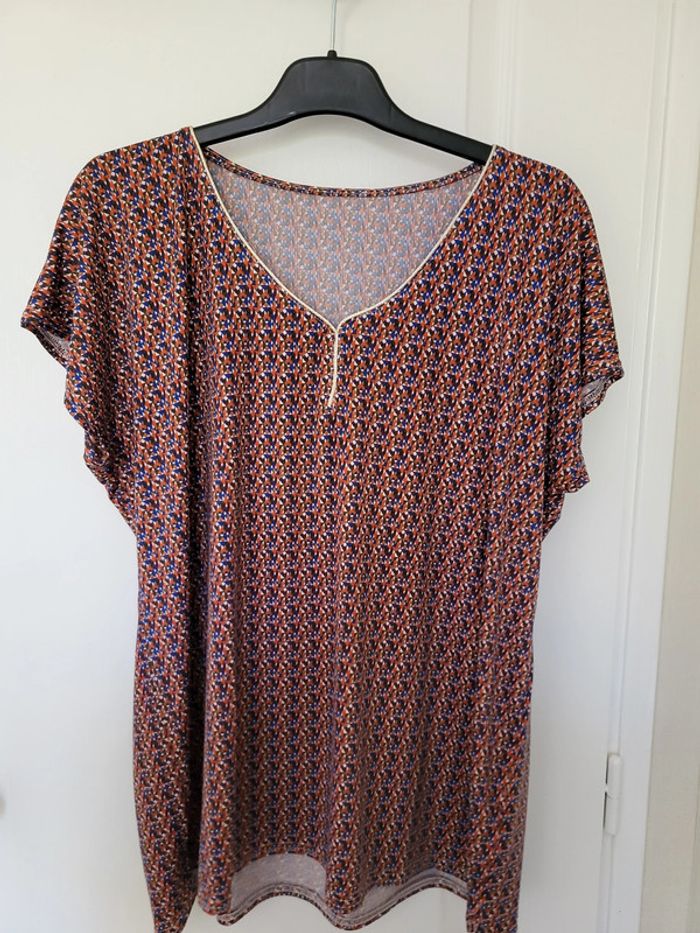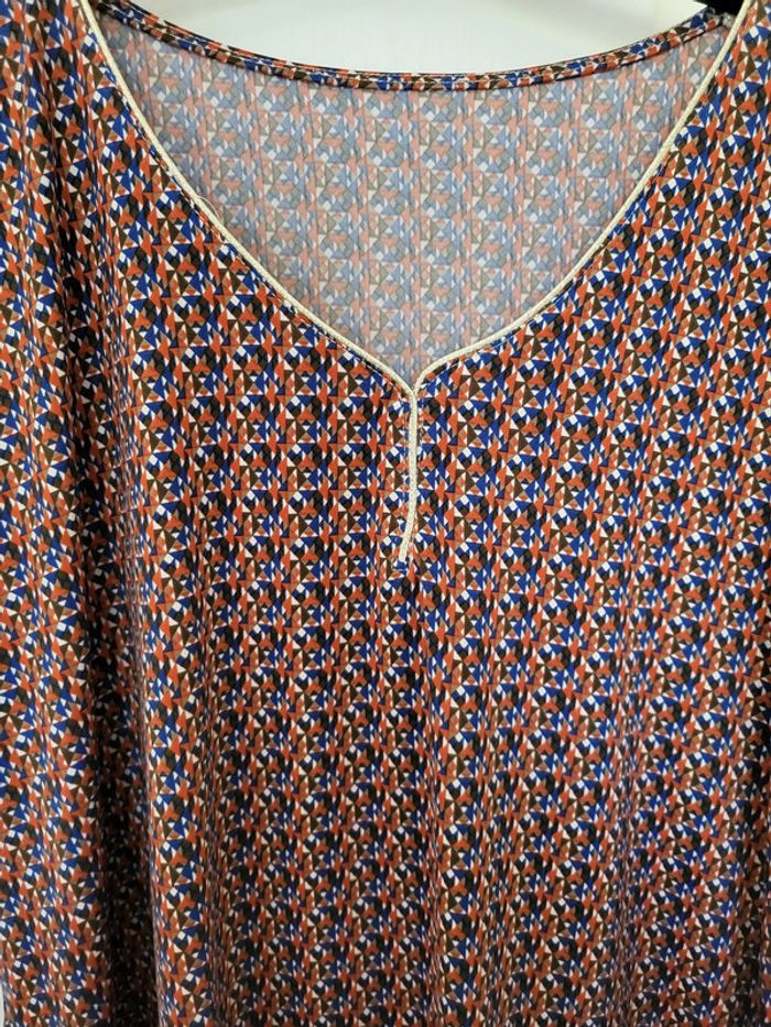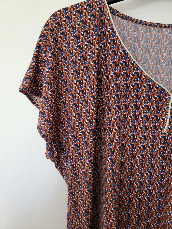 Haut multicolore fluide, motifs géométriques Armand Thiery (étiquette coupée) Manches courtes, col doré Etiquette coupée mais il s'agit d'une taille 4 (voir mesures sur dernière photo) #SILVVêtementsFtXL