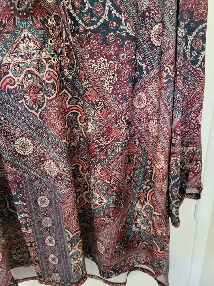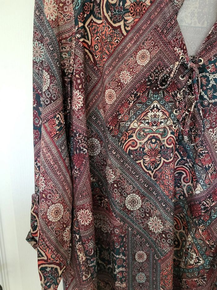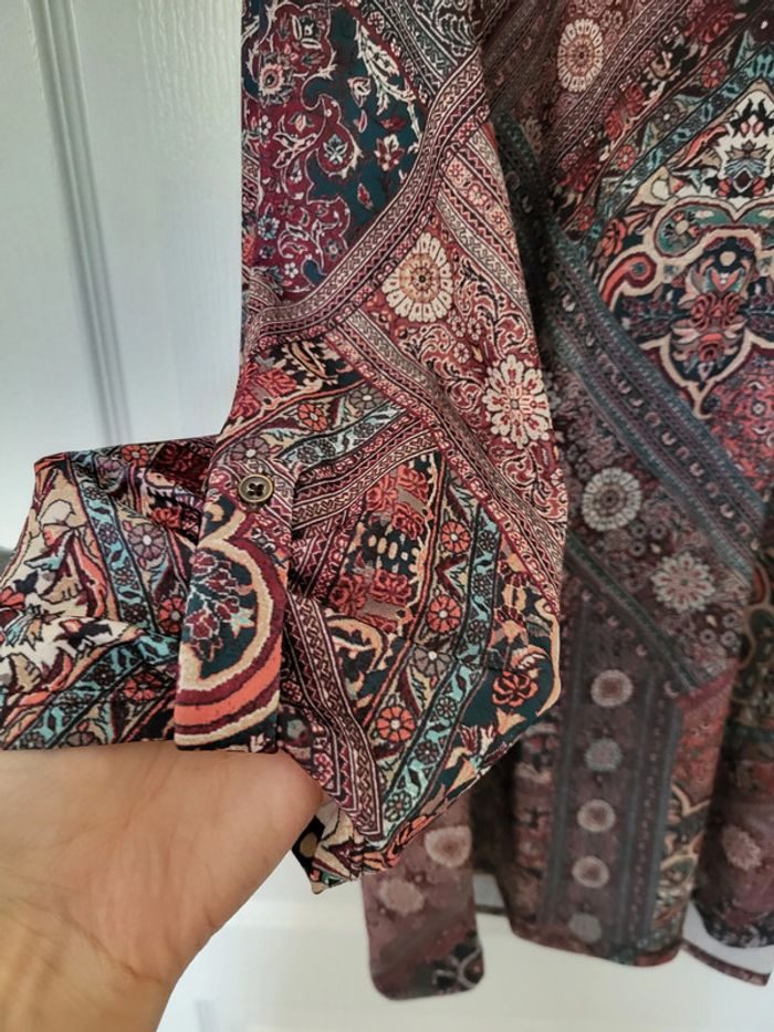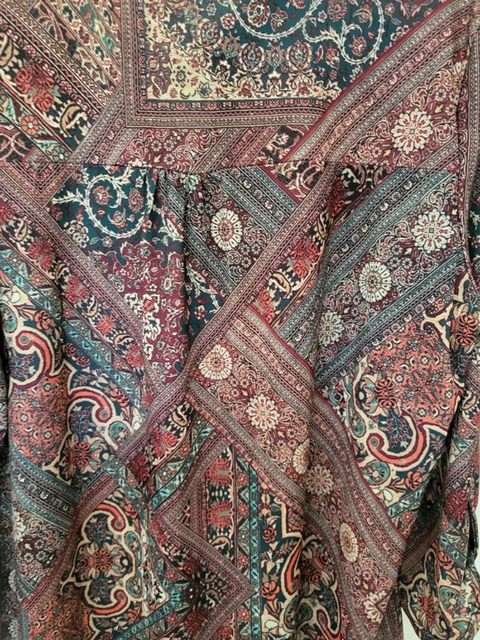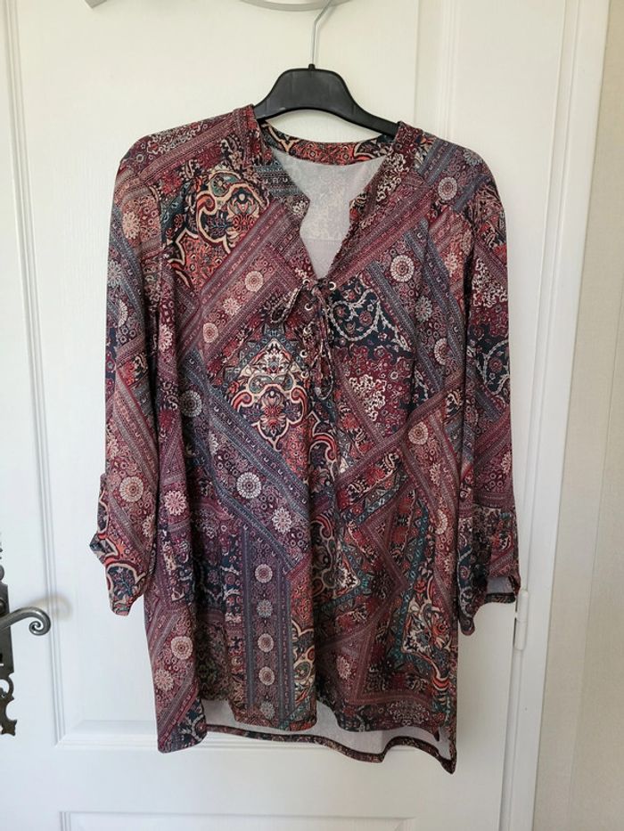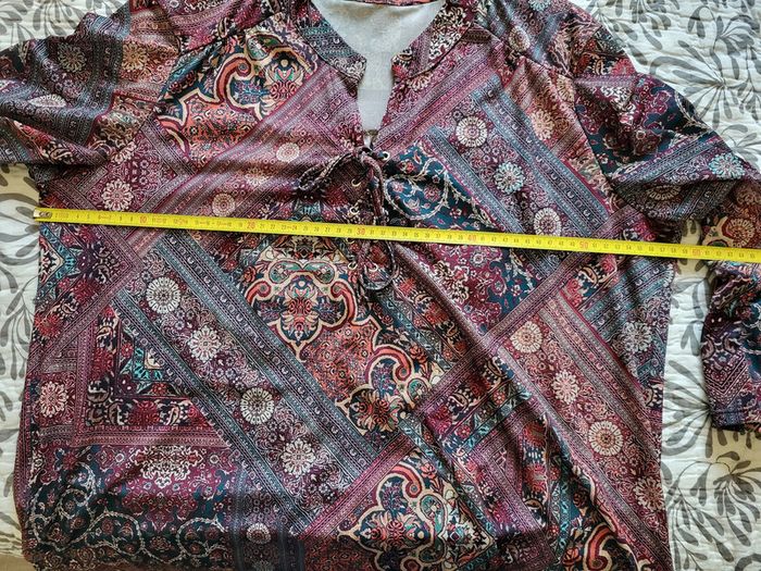 Haut fluide Armand Thiery Multicolore, motifs géométriques, fleurs, tons violet, bleu, rouge, blanc Col V, fermeture avec liens Manches 3/4 relevées Etiquette coupée mais il s'agit d'une taille 4 (voir mesures sur dernière photo) #SILVVêtementsFtXL
