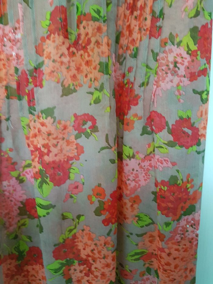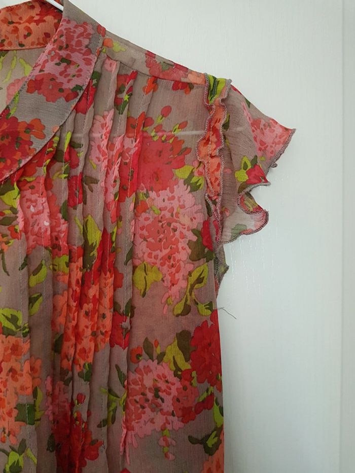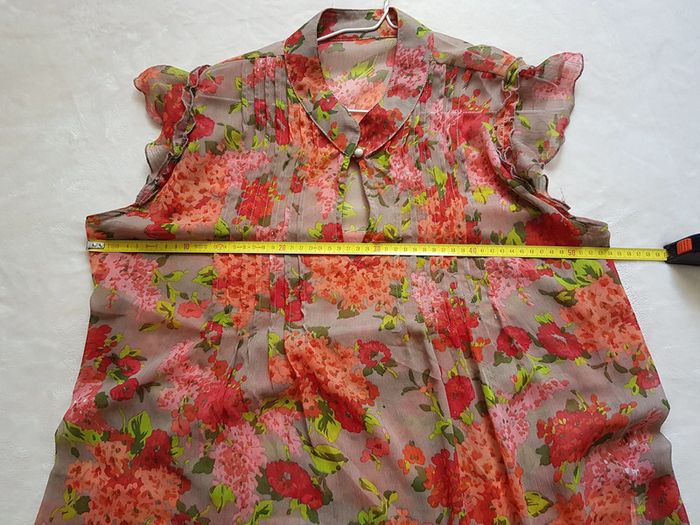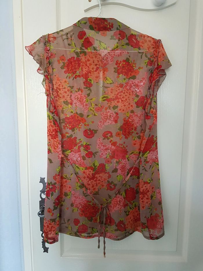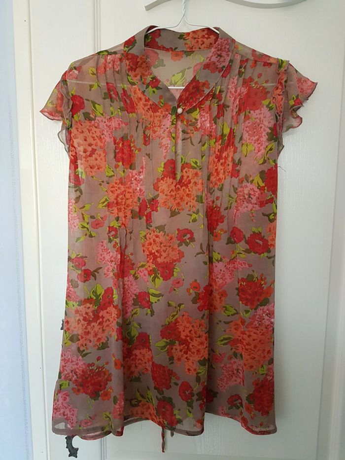 Tunique fluide Plus Beige foncé, rouge, orange Bouton au col Effet transparence Lien à nouer au dos ou sur le devant Motif fleurs Etiquette coupée mais il s'agit d'une taille 4 (voir mesures sur dernière photo) #SILVVêtementsFtXL