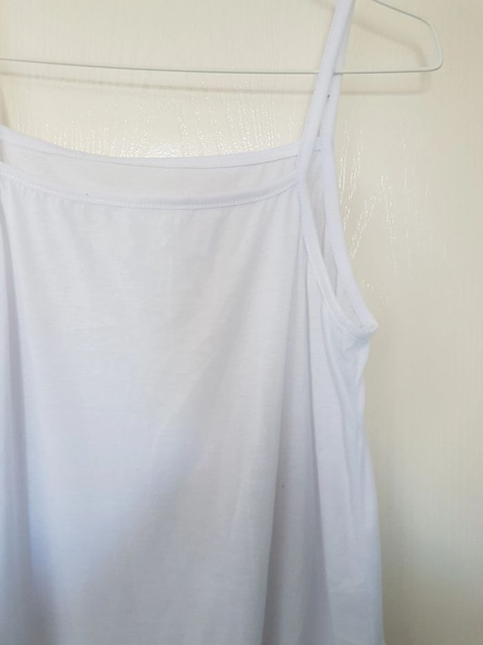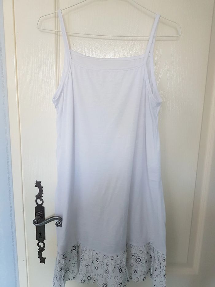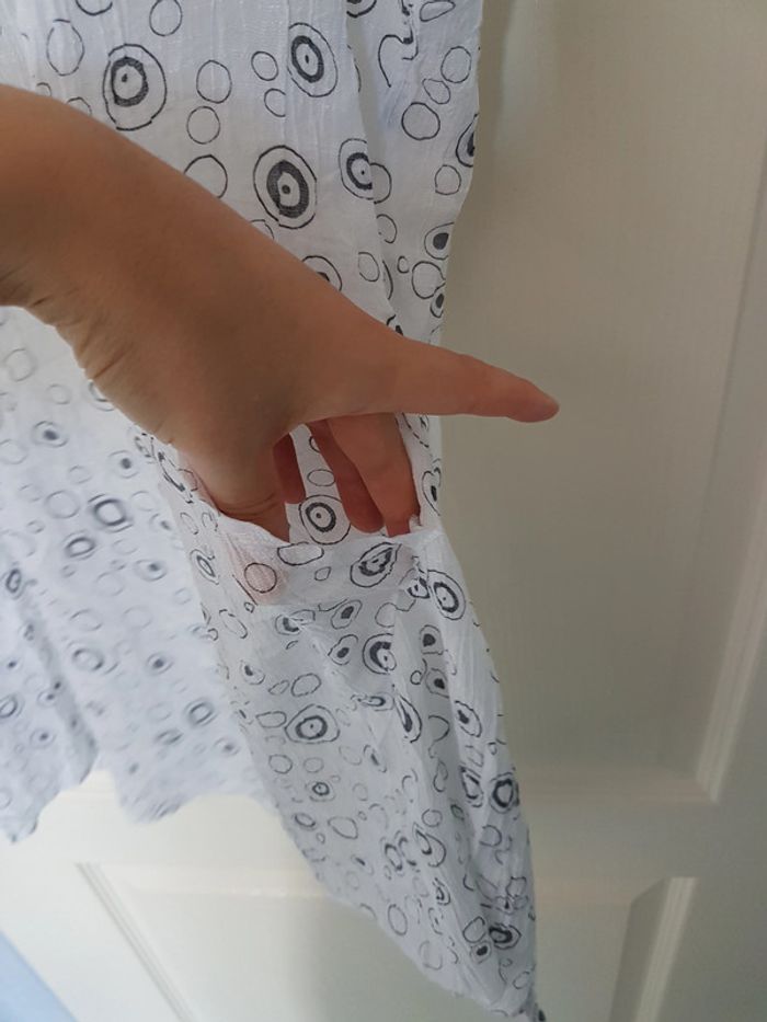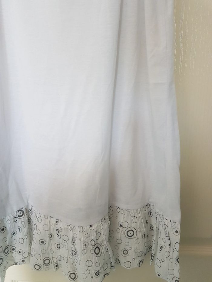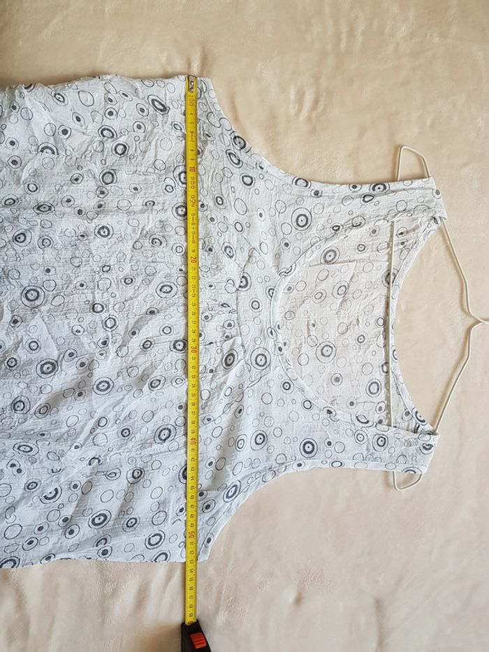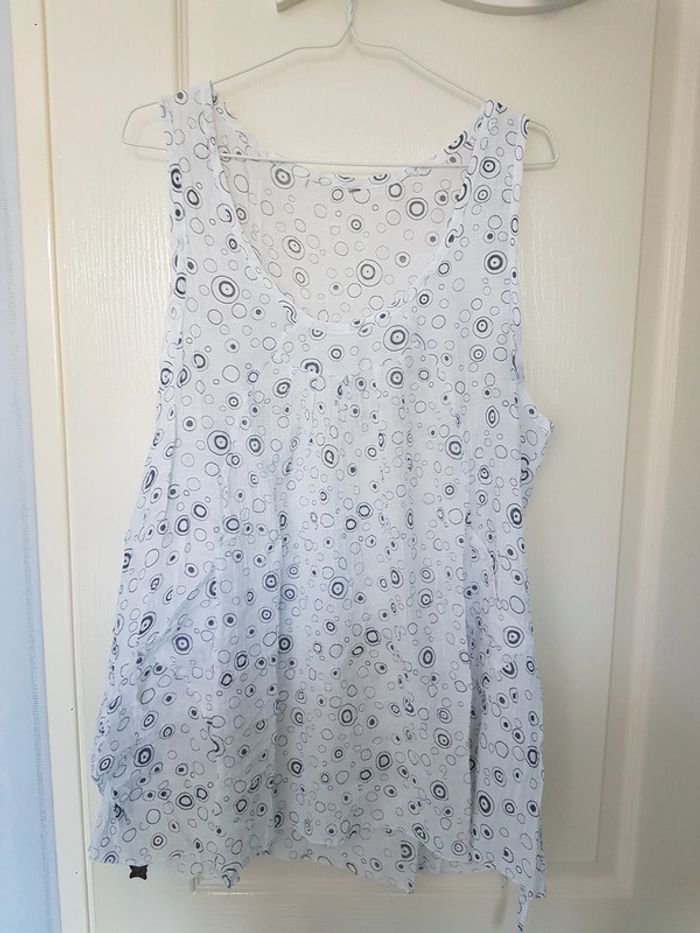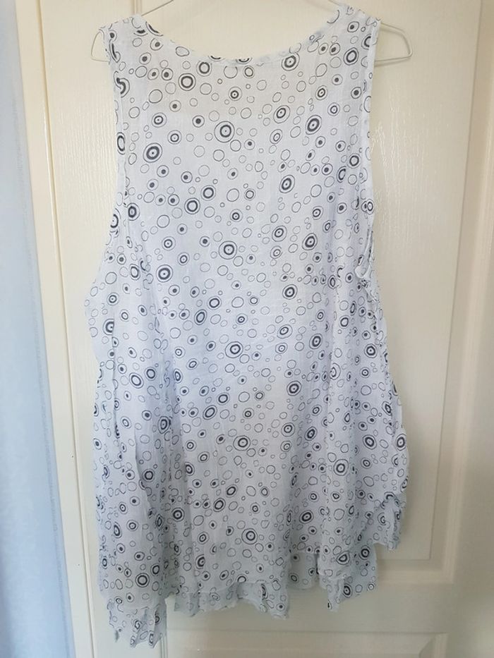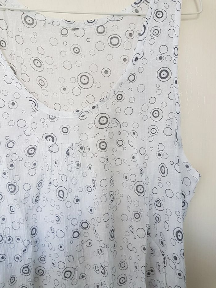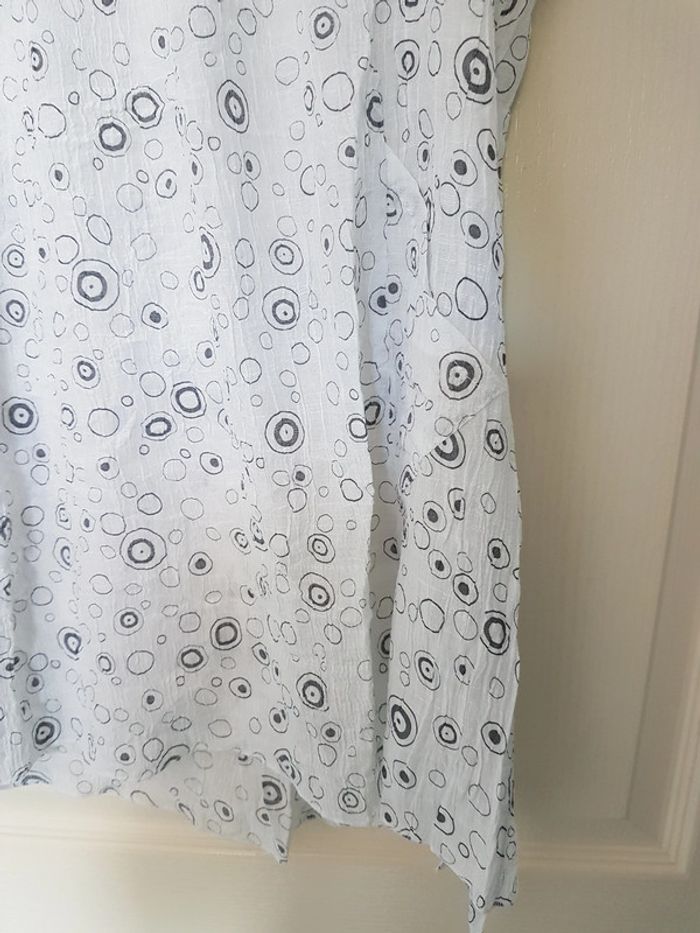 Tunique blanche et grise Motifs ronds Ensemble : 1 tunique blanche près du corps, 1 tunique fluide par-dessus Taille unique, achetée en boutique indépendante, portée par quelqu'un faisant du XL #SILVVêtementsFtTU #SILVVêtementsFtXL
