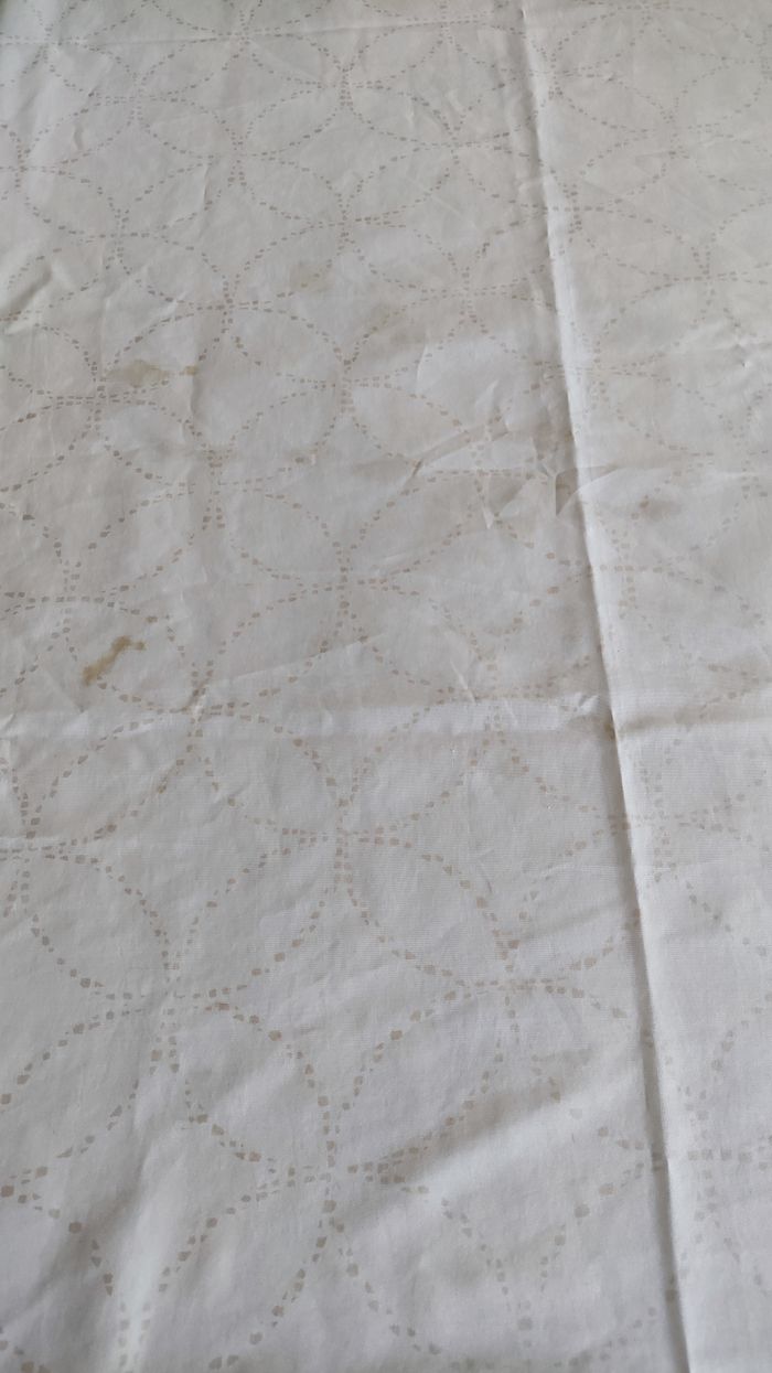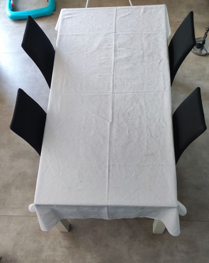 Nappe blanche avec des motifs Imperfections : tâche, idéal teinture textile , cette nappe, attend que vous pour lui redonner une belle éclat de seconde vie et sera ravie de faire partie de votre intérieur . Dimensions : 238cm longueur 142 cm de largeur Lavage en machine a 30° PS: vendu seule, mais également en lot de 10 pièces voir autre annonce sur mon dressing. #nappe