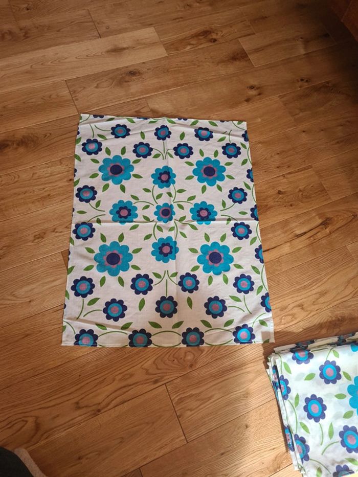 Lot 6 serviettes de table synthétique vintage Dimensions 62 X 48 cm Motif fleurs année 60 bleu Pas d'étiquette certainement fait main