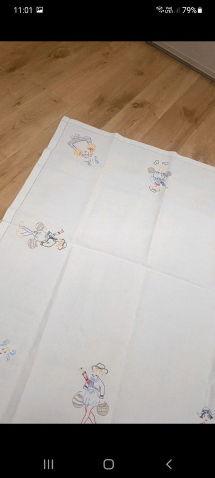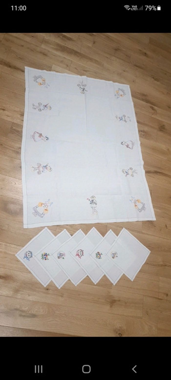 Vintage 💕 Nappe coton 116 x 86 cm brodée personnages avec 6 serviettes coordonnées 22 X 22