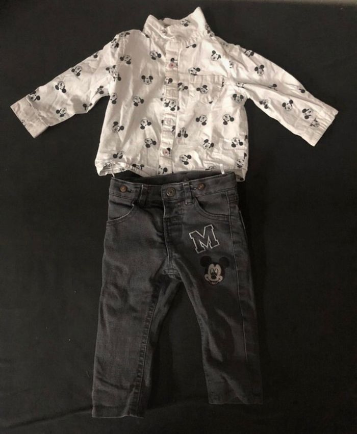Ensemble composé d’une chemise blanche à motifs noirs et d’un jean noir. Ensemble en 12 mois en très bon état.