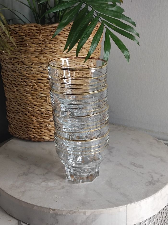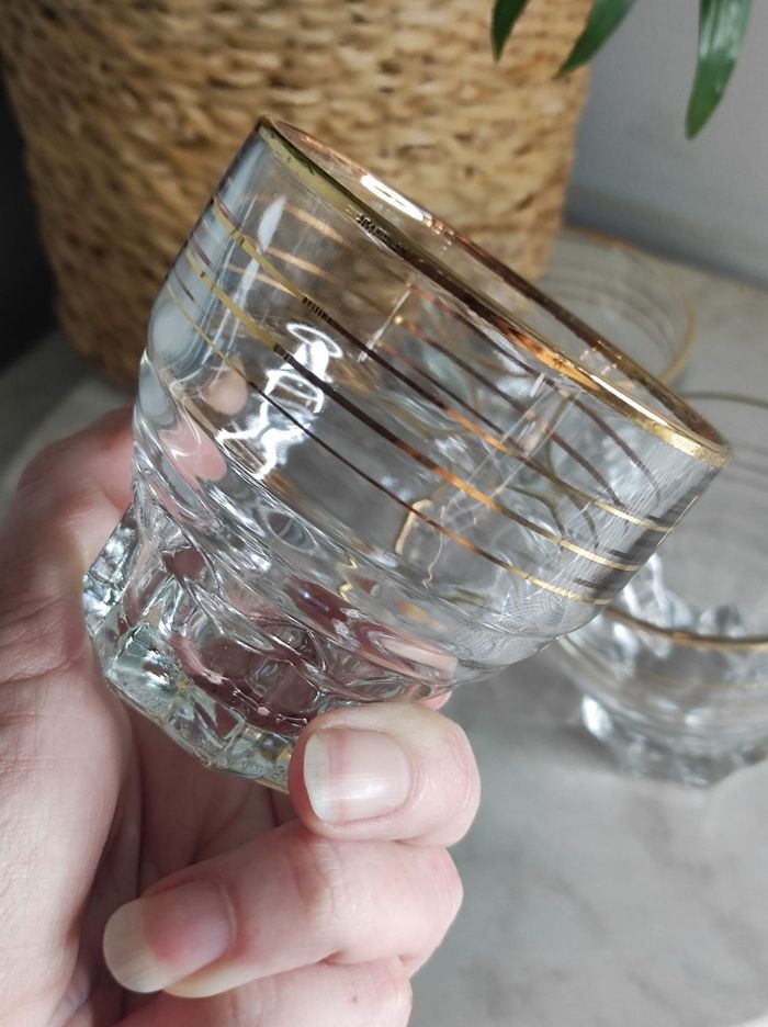 Joli lot de 4 verres au look rétro pour apéritif ou digestif Verre bordé d un liseret doré. Et pied en firme d'étoile. Dimensions H 6,8 x D 7 État impeccable