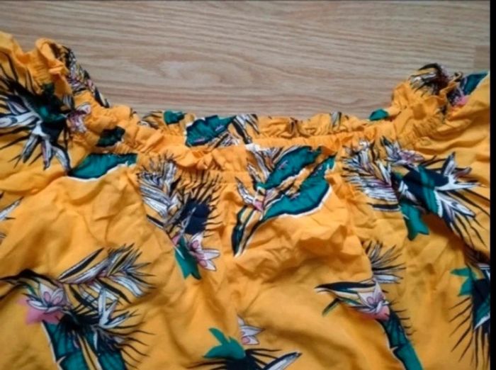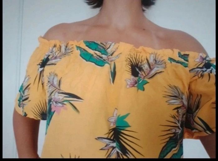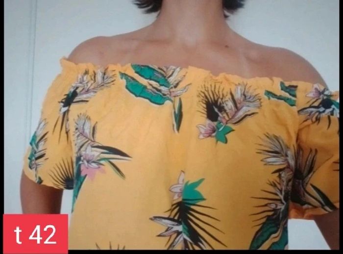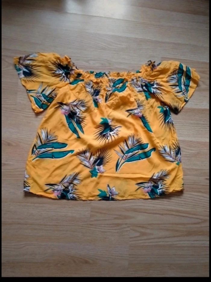Jolie top épaules dénudées. Woman by gémo. Taille 42 Jaune, motifs fleurs des îles Très bon état. 3 Euros Envoi par mondial Relay Remise en main propre possible sur Beauregard Vendon Riom ou Clermont Ferrand 63 #ptitesev63vetement42