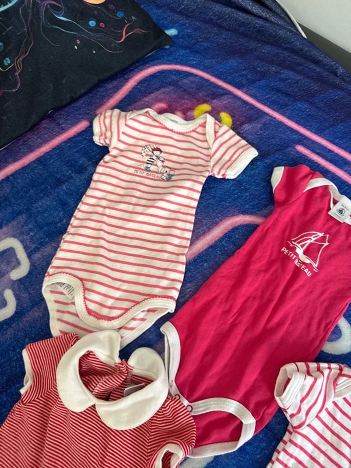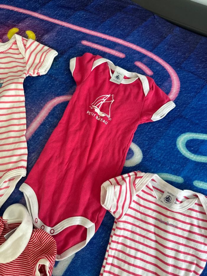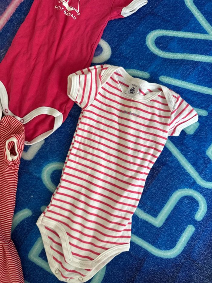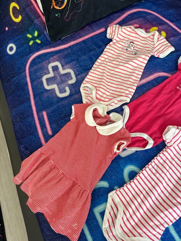 1 robe très peu porté 6 mois rouge et blanc 3 bodies deux rayé rose et un rose fushia petit bateau 6 mois très peu porté