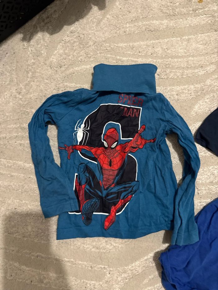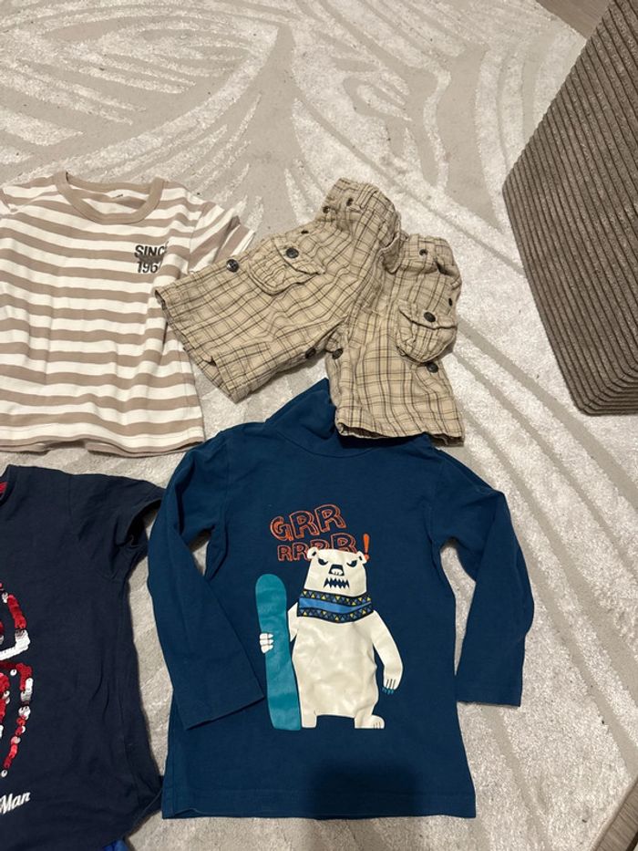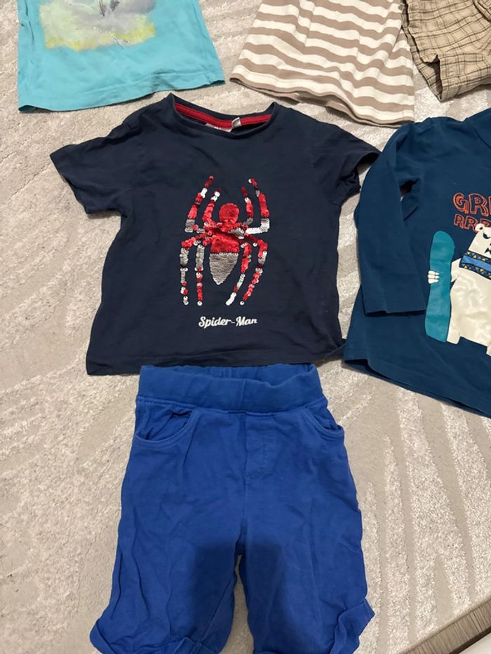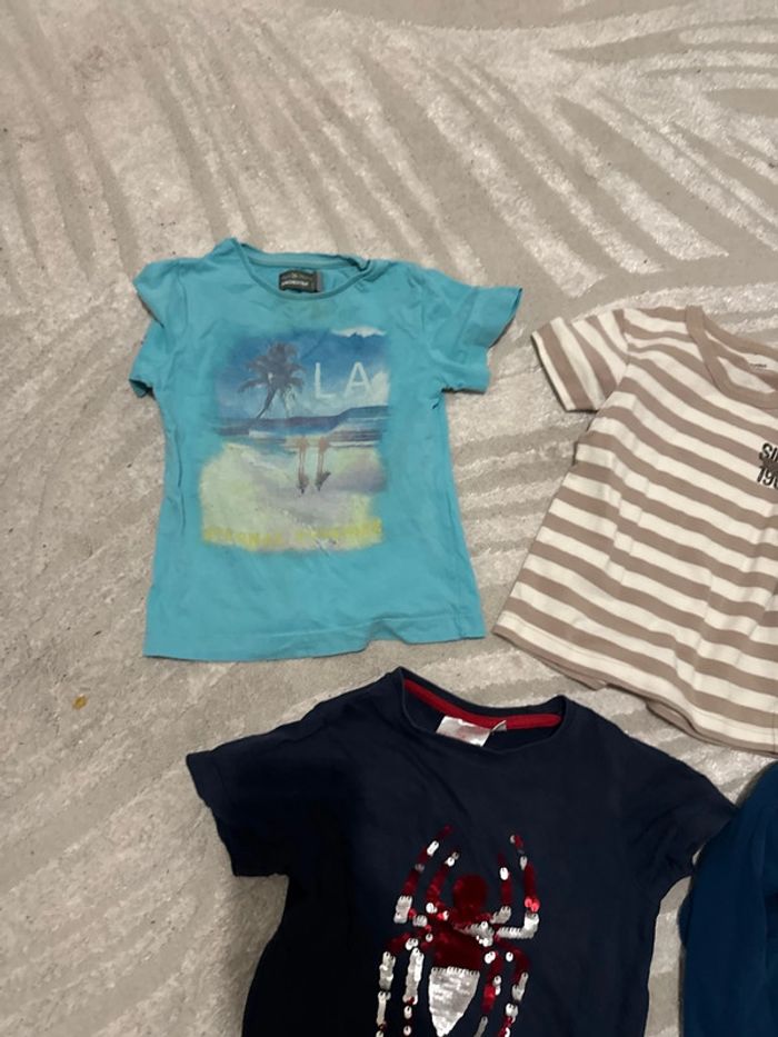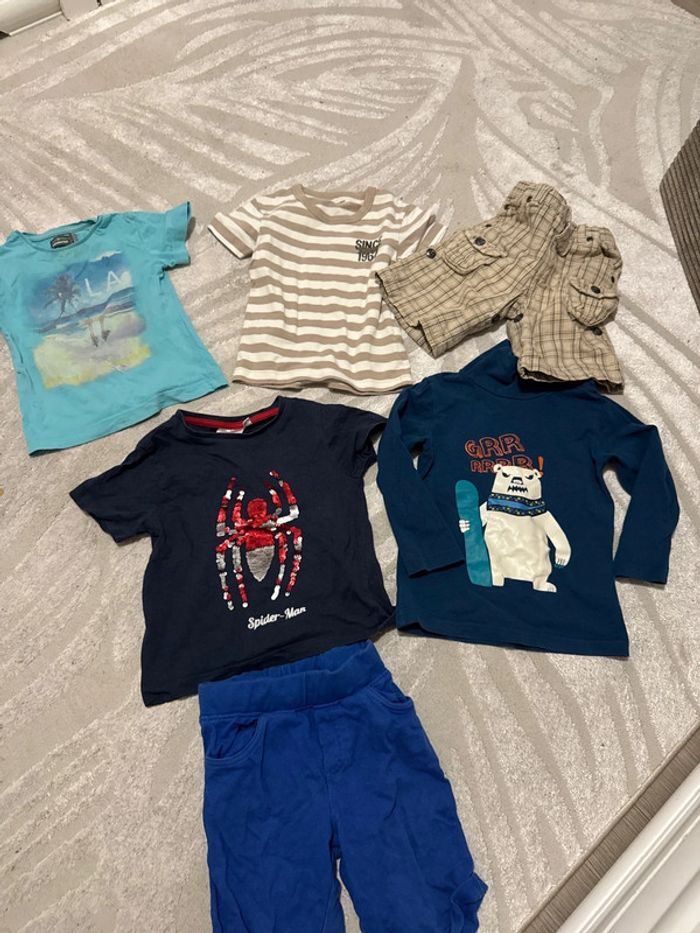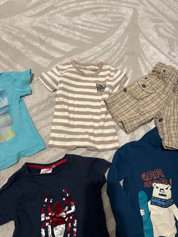 3 tee shirt 3 ans Un sous pull gemo Un short bleu 3 ans Un short à careeaux beige J’offre un sous pull Spiderman voir dernière photo 3 ans mais taille petit selon moi