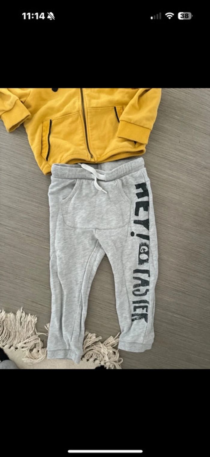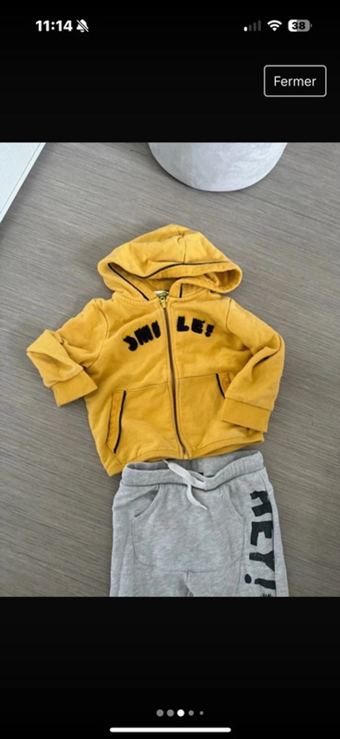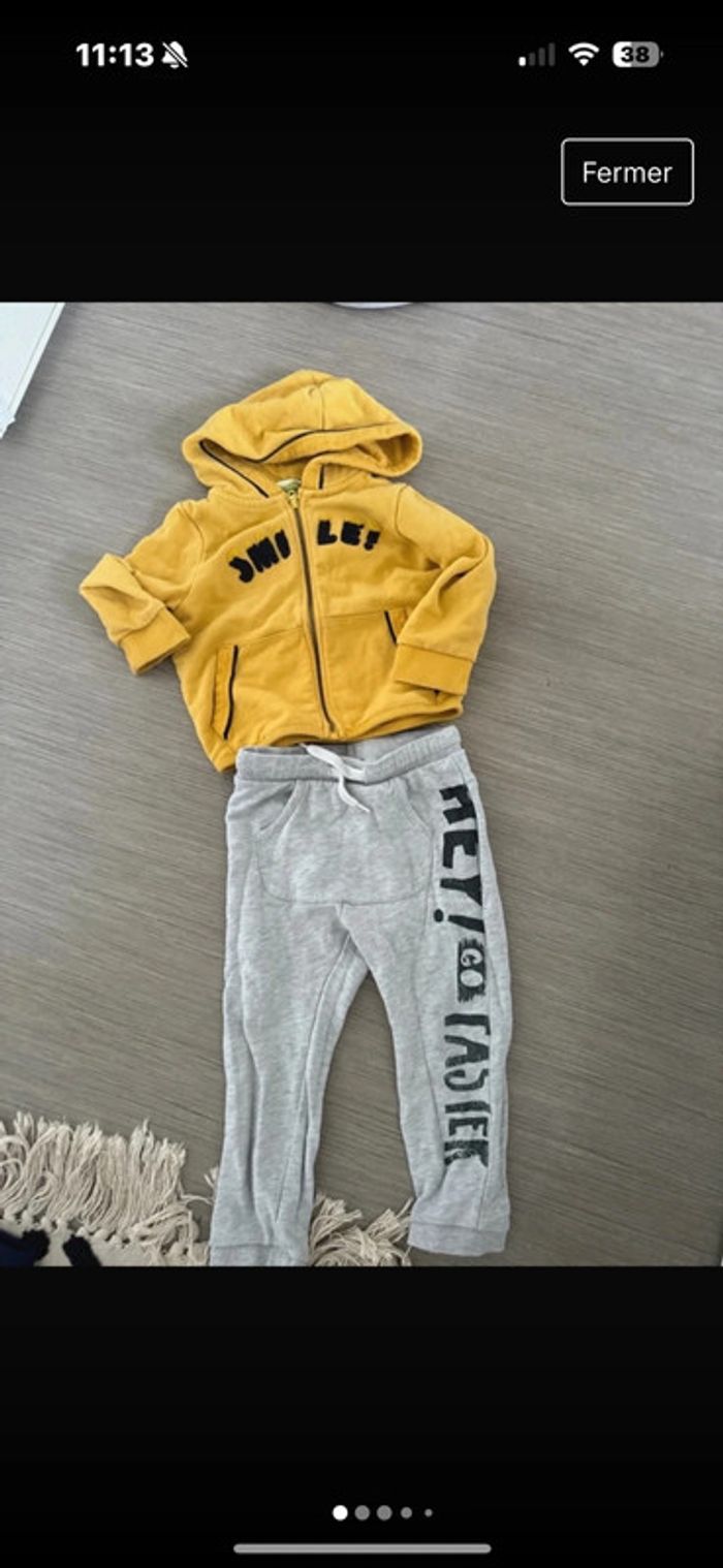 Gilet zip capuche jaune et noir Pantalon jogging kiabi 36 mois très bon état à noter juste écriture efface légèrement sur le pantalon voir photo rien de bien méchant