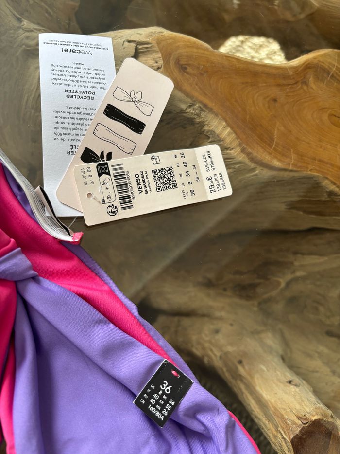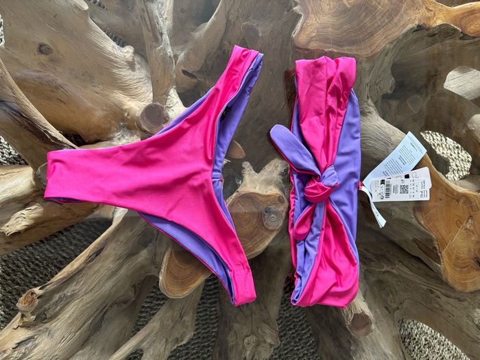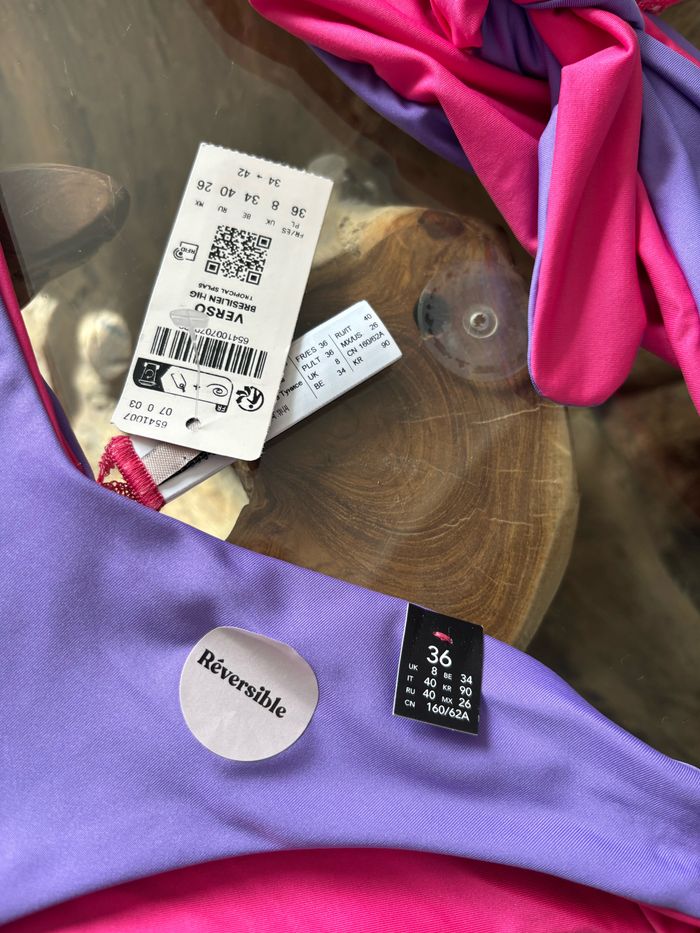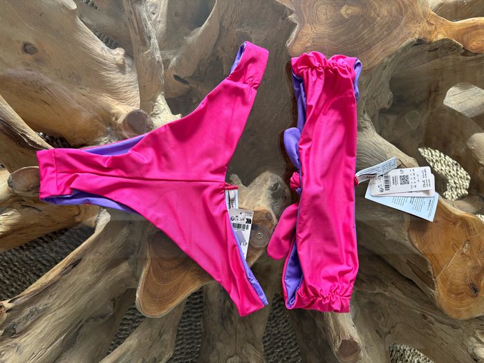 Maillot de bain 2 pièces Etam réversible : haut et bas. Un côté uni violet, un côté uni rose Taille 36 Haut : verso bandeau. Peut se porter de différentes façon Bas : verso brésilien high Neuf avec étiquette Possibilité de vendre que le haut ou le bas (me contacter) N'hésitez pas à faire des lots ✨ réduction dès 2 articles (d'autres maillots de bain à vendre) Pour voir mes autres maillots de bain à vendre : #mdbludi2607 ✉️Pas de remise en main propre