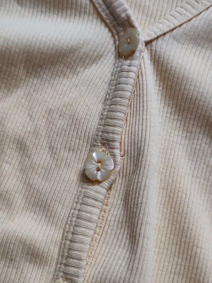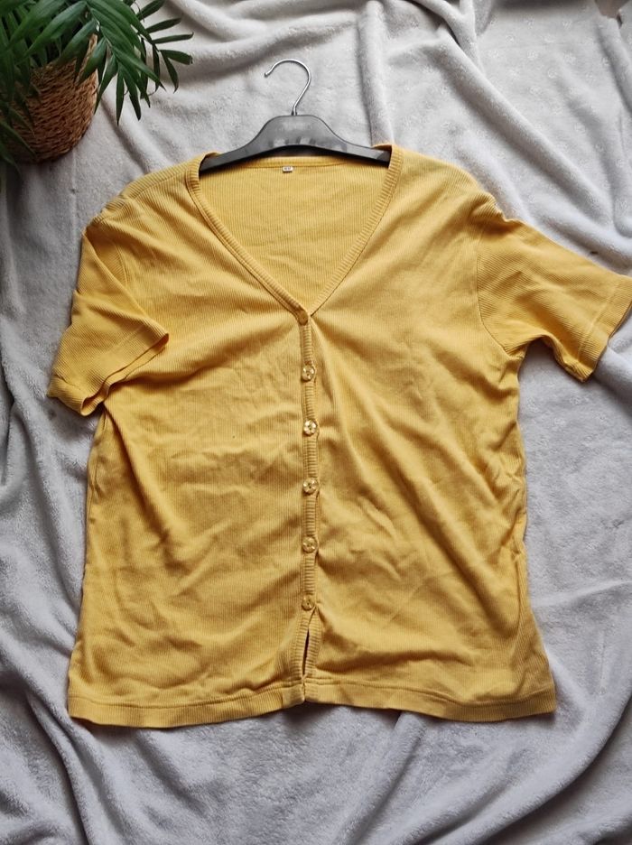 jolie petit haut façon tee shirt / gilet à manches courtes et fermeture à boutons en forme de coeur. 100% coton. Taille 46 / 48. Peu porter en parfait état.