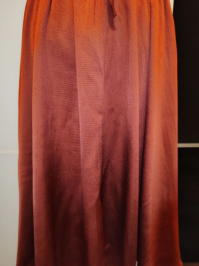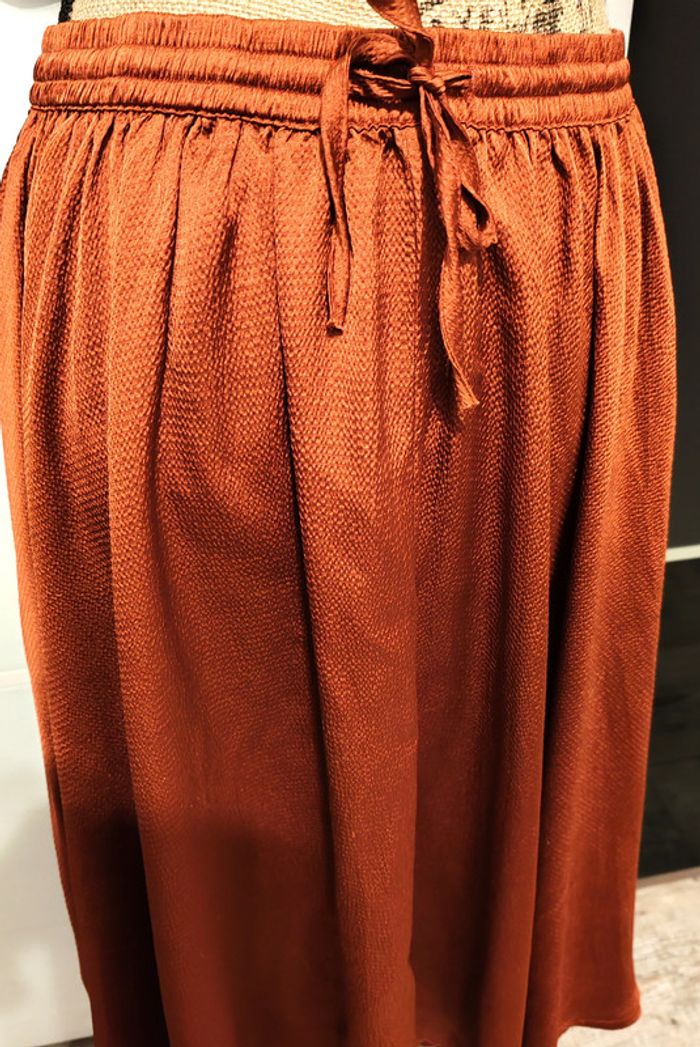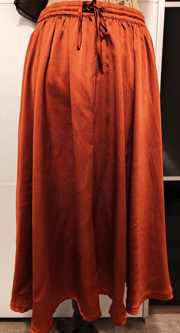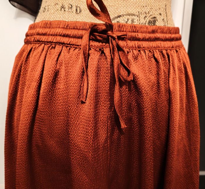 Jupe longue taille 40 orange cuivré satiné. L'étiquette de la taille et de la marque a été enlevée soigneusement car ça gênait ma maman mais elle achetait toujours des vêtements de qualité. Taille élastique avec cordon de resserrage. En très bon état. Dimensions à plat : - longueur 70 cm environ. - taille 37 cm D'autres vêtements sont en vente dans mon dressing, réduction automatique de 10 à 20% sur les lots à partir de 2 articles achetés.