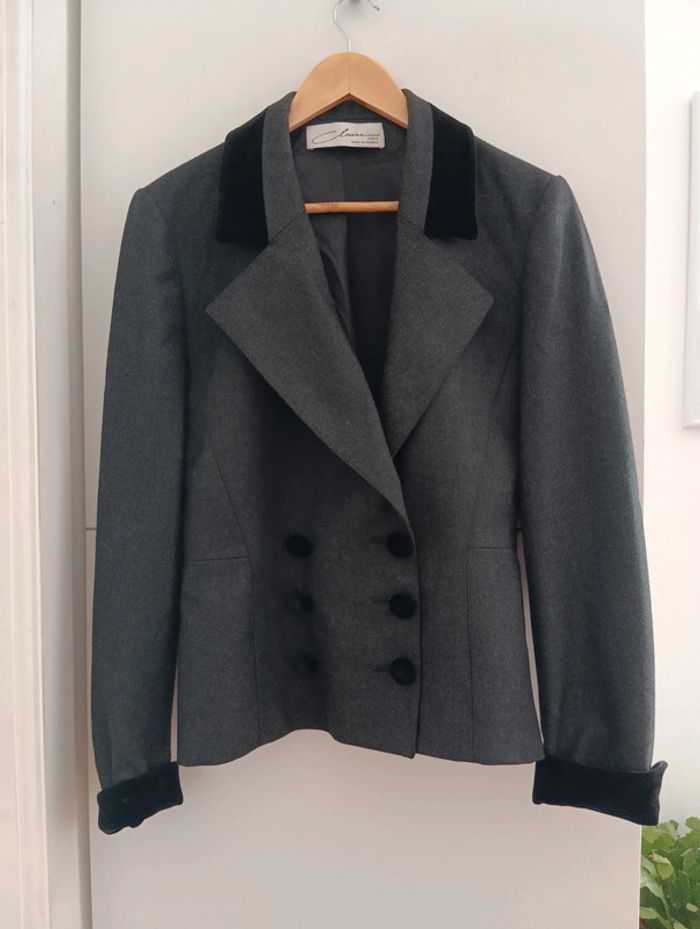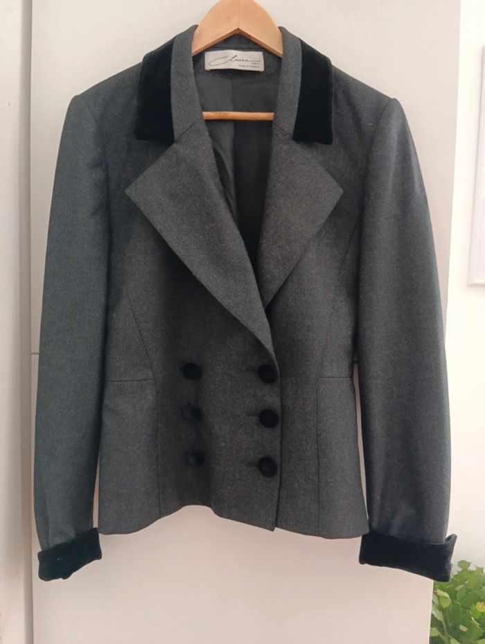 Veste blazer grise vintage Pure laine Double boutonnage, Claire made in France Col et bout des manches velours ras noir. Taille 40 estimée Martingale au dos. Mesures Epaules 44cm Aisselles 48cm Longueur 59cm