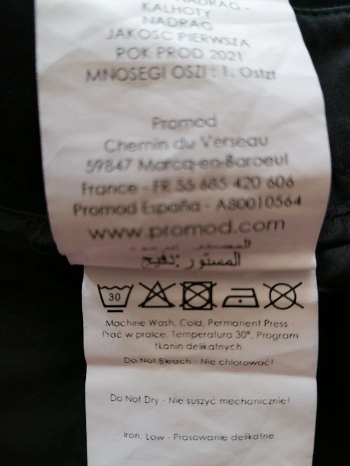 Très beau pantalon de chez Promod 2 poches latérales 2 fausses poches à l'arrière fermeture par agrafes, boutons, zip 49 % coton 28 % polyester 20 % polyester recyclé 3 % élasthanne En excellent état, aucun défaut comme neuf