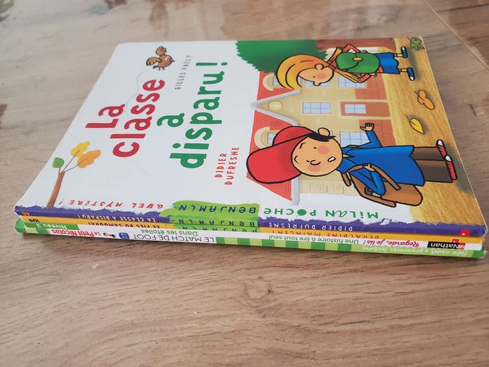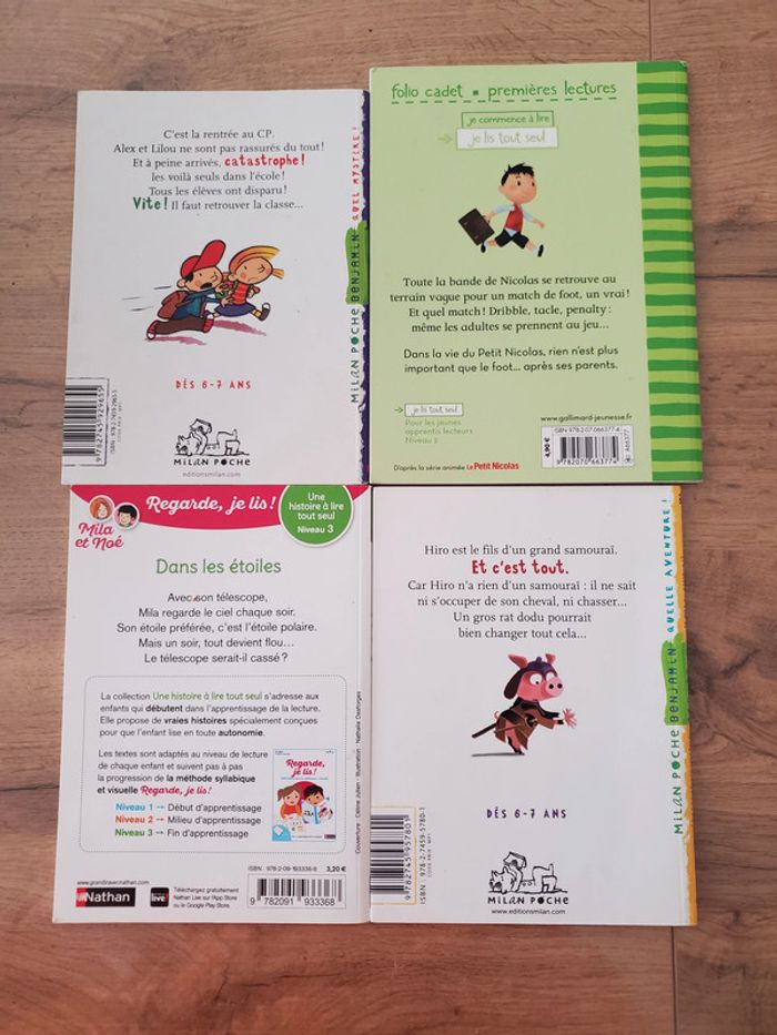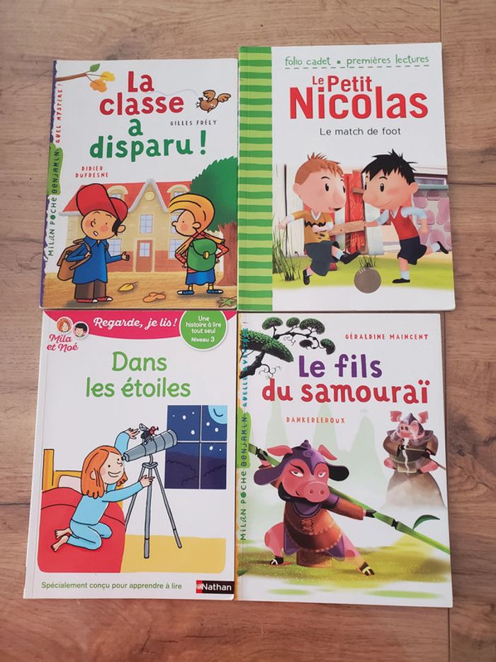 en très bon état Pour apprendre à lire 1ères lectures Le petit Nicolas La classe a disparu Le fils du Samouraï Dans les étoiles Envoi possible avec tout transporteur (VINTED GO à éviter car le dépot du colis risque d'être plus long: pas à proximité et casiers peu disponibles). Envoi en général dans la JOURNEE si RELAIS COLIS, CHRONOPOST ou UPS choisis. REMISES PROGRESSIVES si plusieurs articles achetés. Allez voir mes autres ventes : nombreux articles livres, CD, jeux, jouets, déco, maison, cuisine, bijoux femme, fillette + vêtements enfant, femme, homme + chaussures et sacs etc...