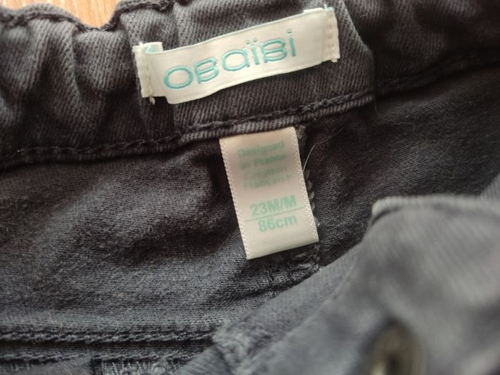 Pantalon jean en bon état car sa couleur bleu marine passe, sinon il est en très bon état. Marque Obaïbi. Taille 24 mois.