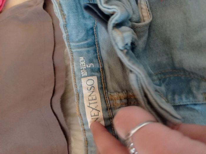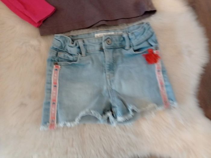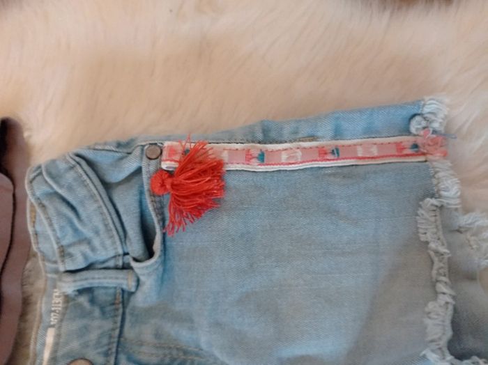 Short en jean avec pompon effet déchiré (volontaire) un petit côté bohème boho chic T-shirt manche longue ixoo avec une lettre en velours qui s estompe comme montre en photo #izianacinqans #ixoo #inextenso