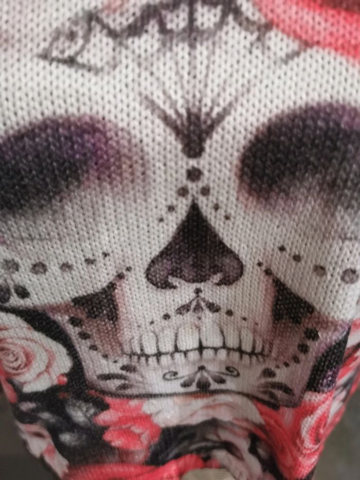Magnifique pull tête de mort et fleurit taille L/XL Manches courtes En maille bien coloré Très bon état