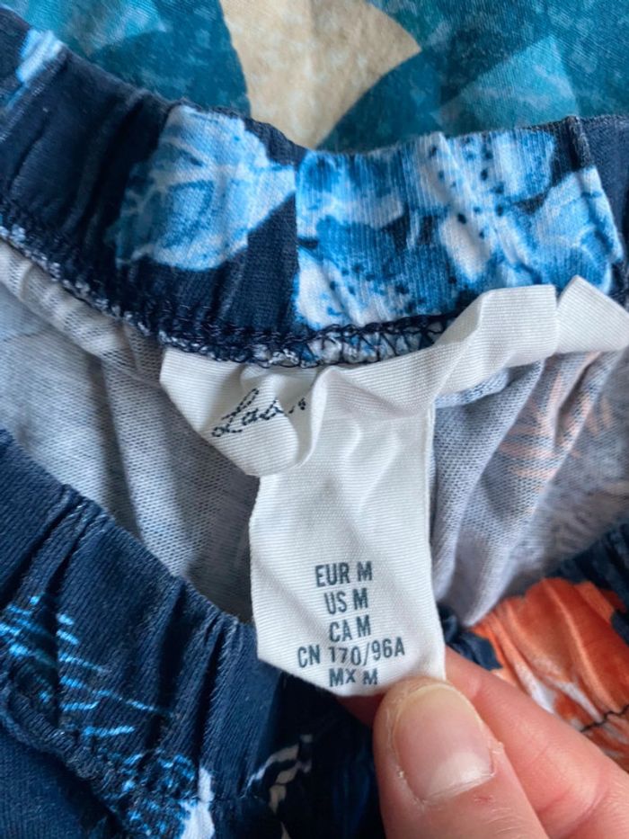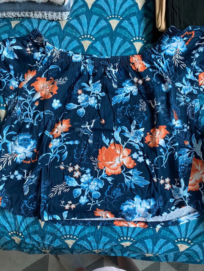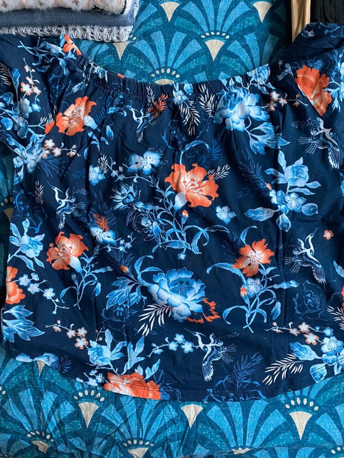 Tee-shirt de la marque H&M avec les épaules dénudées, imprimé bleu et orangé. Motif sympa pour le printemps. TM. Jamais porté.