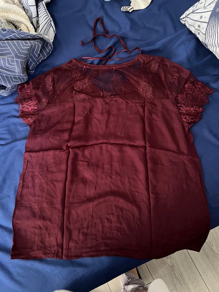 Tee shirt Camaieu dentelle en haut et au niveau des manches. Couleur bordeaux. Taille L. Neuf mais porté.